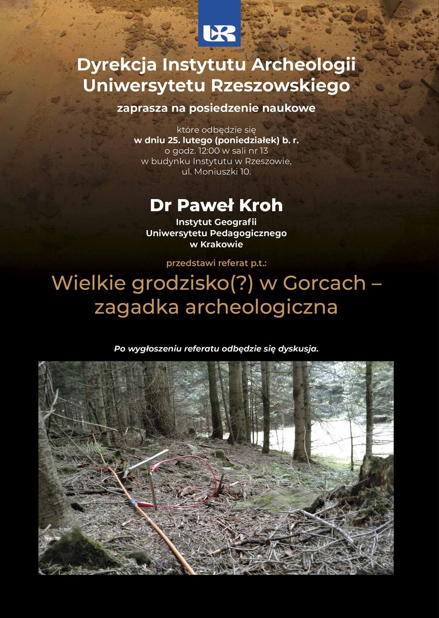 Wykład mgr Kamila Karskiego Podczas wykładu został przedstawiony kompleksowy program badań i wyników przeprowadzonych od 2016 roku prac archeologicznych na terenie dawnego obozu, począwszy od analizy źródeł historycznych i wizualnych, przez prace terenowe, obejmujące prospekcję geofizyczną, badania powierzchniowe, inwentaryzację terenu, wykopaliska i konserwację odkrytych artefaktów. Termin/miejsce: 14 stycznia 2020 r., godz. 12:00 w sali nr 13, w budynku Instytutu Archeologii UR |