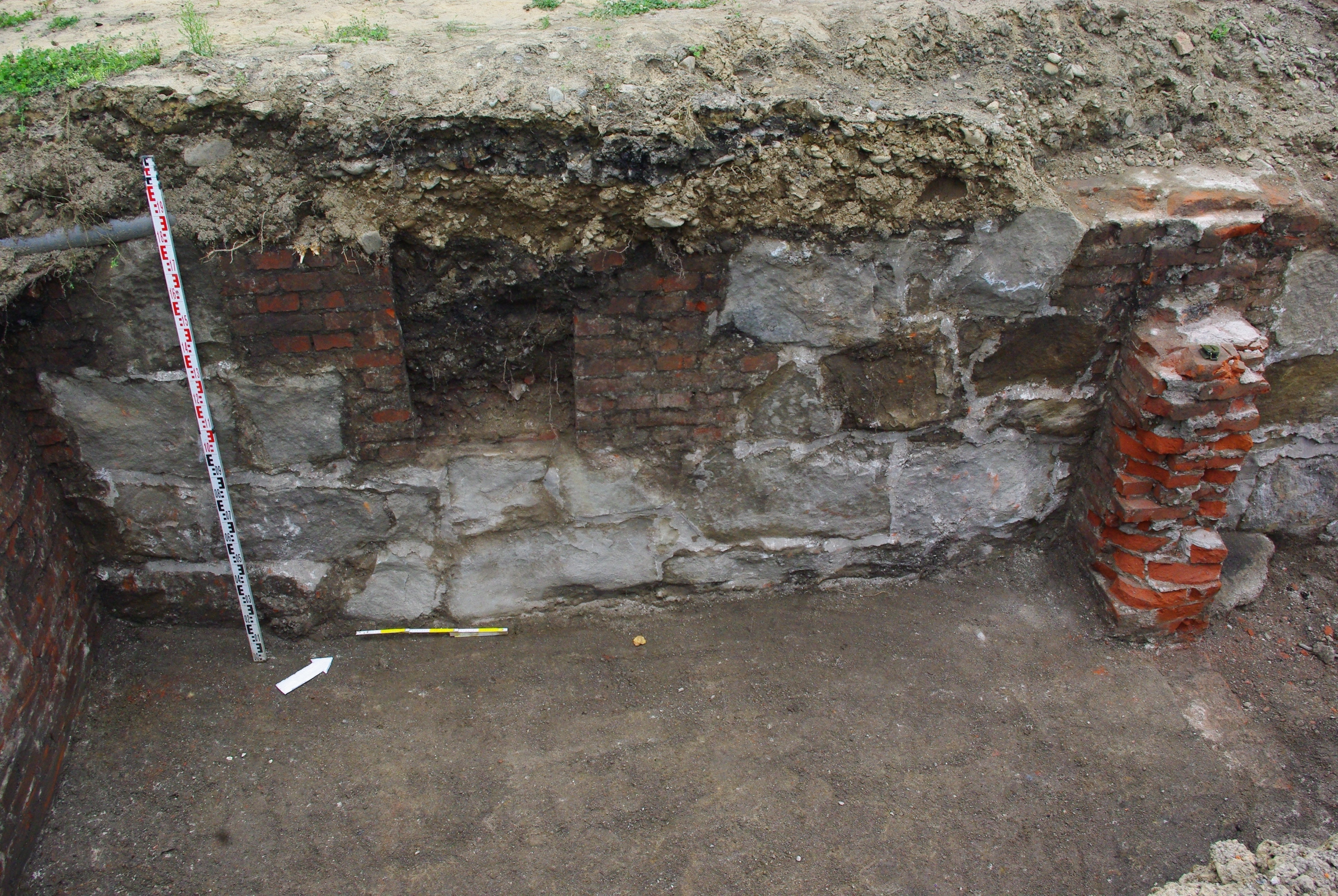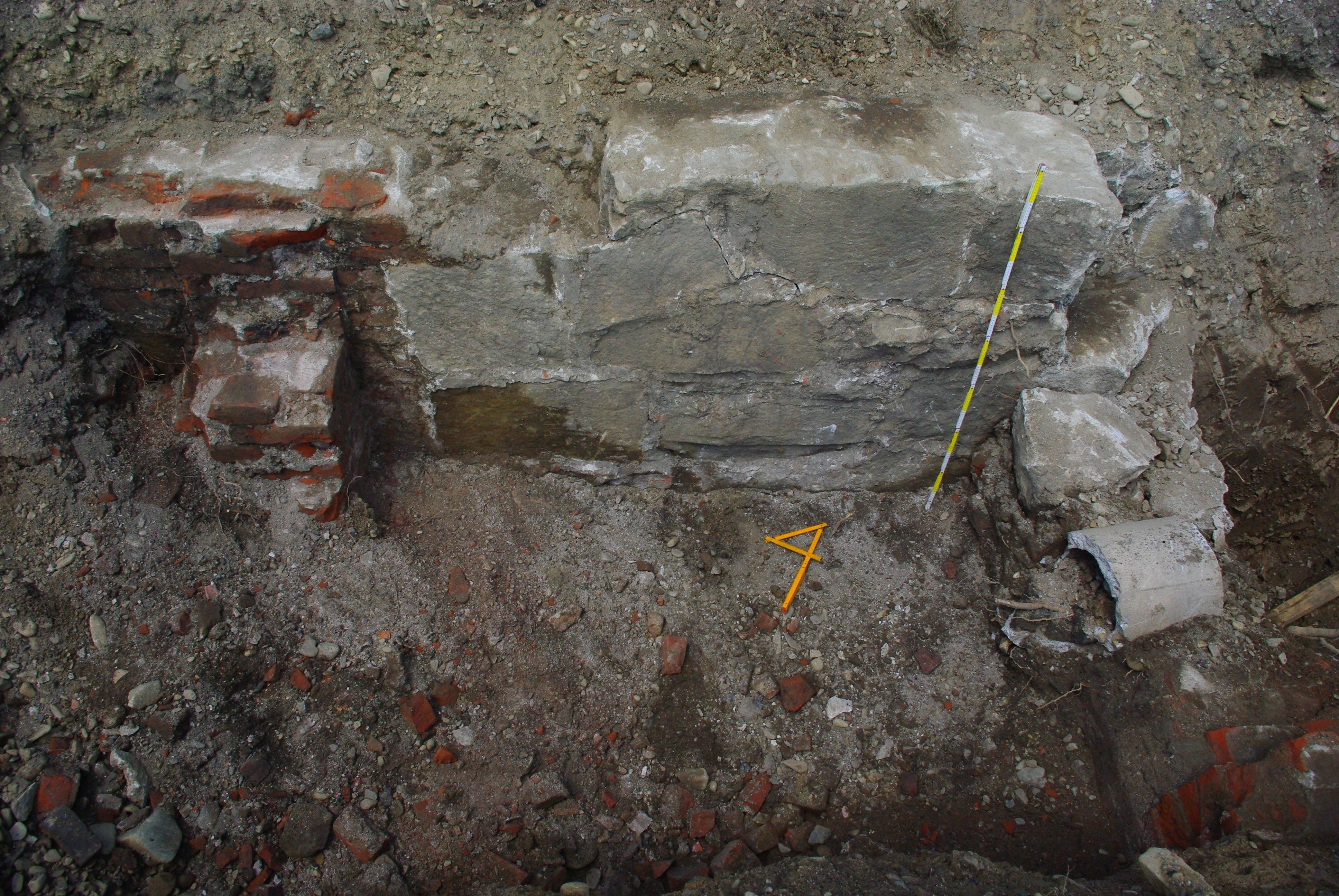 W trakcie badań natrafiono także na kamienno-ceglane fundamenty budynku. Przeprowadzona kwerenda pozwala przypuszczać, iż budynek ten stanowił pierwszy posterunek bieckiej policji państwowej, który powstał w końcu wieku XIX (pełnił także funkcję posterunku austriackiej policji kolejowej). Uległ zniszczeniu w końcowych latach II wojny światowej wskutek bombardowań. Obiekt ten widoczny jest na zdjęciach lotniczych z lat 1914-1915.