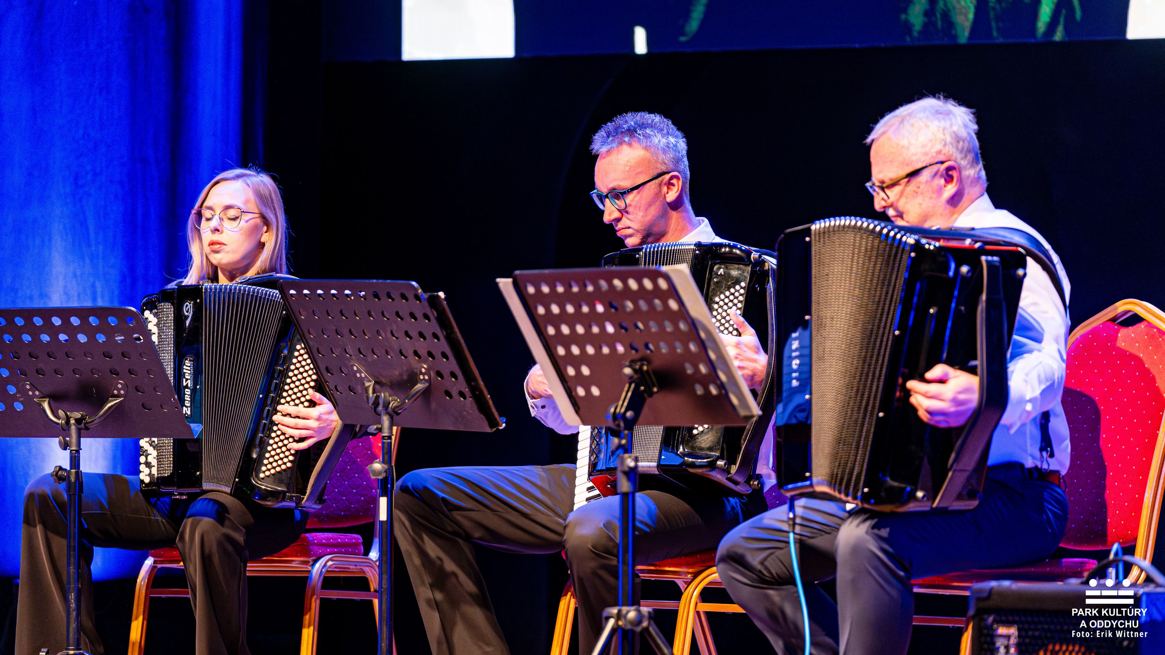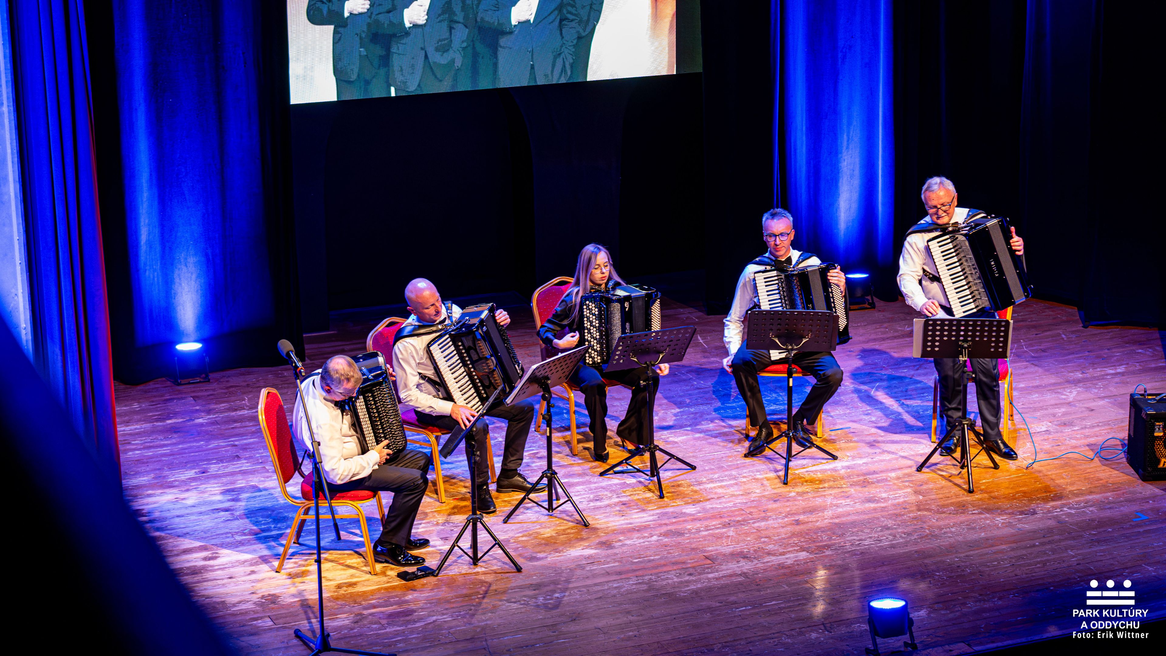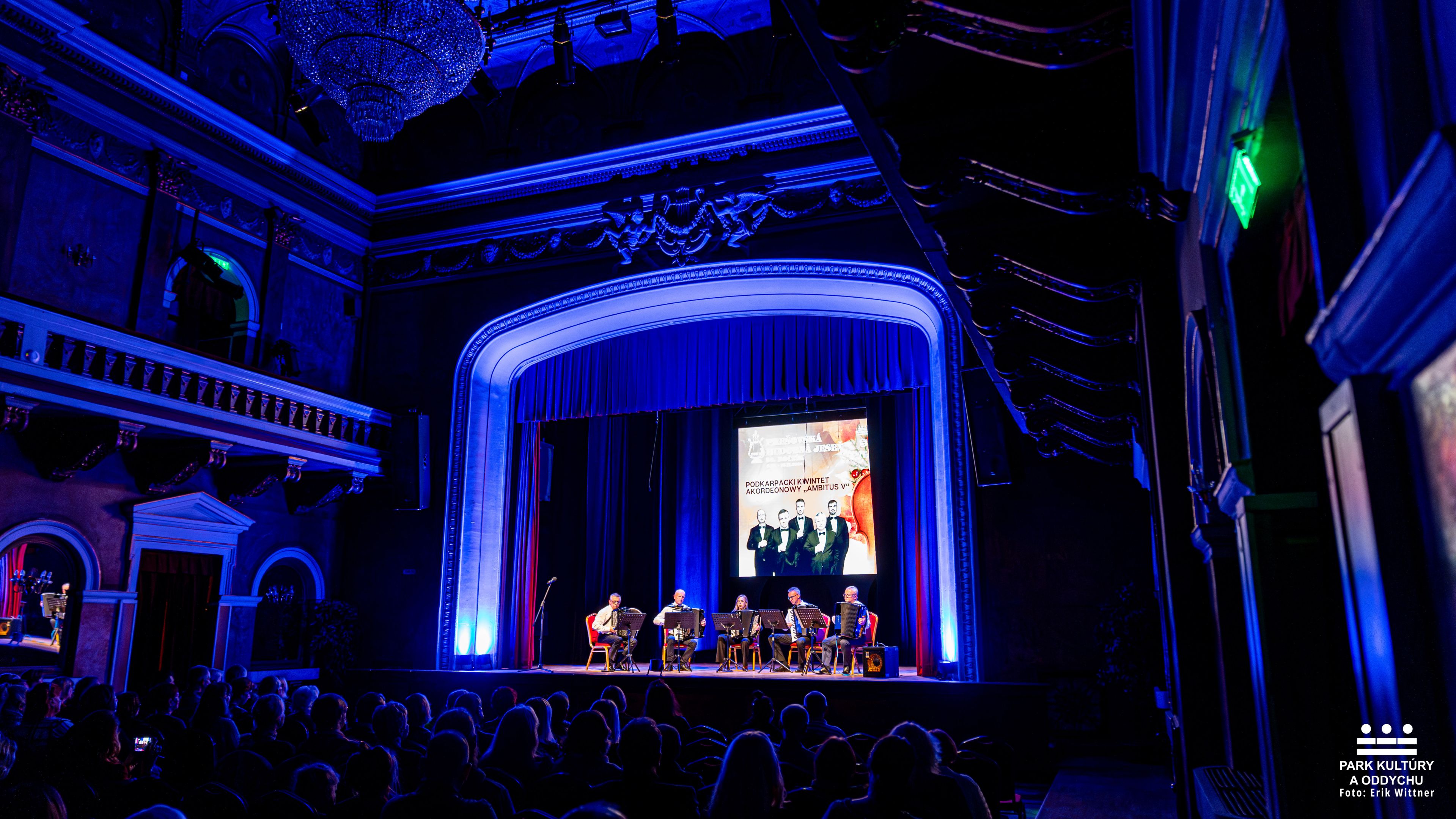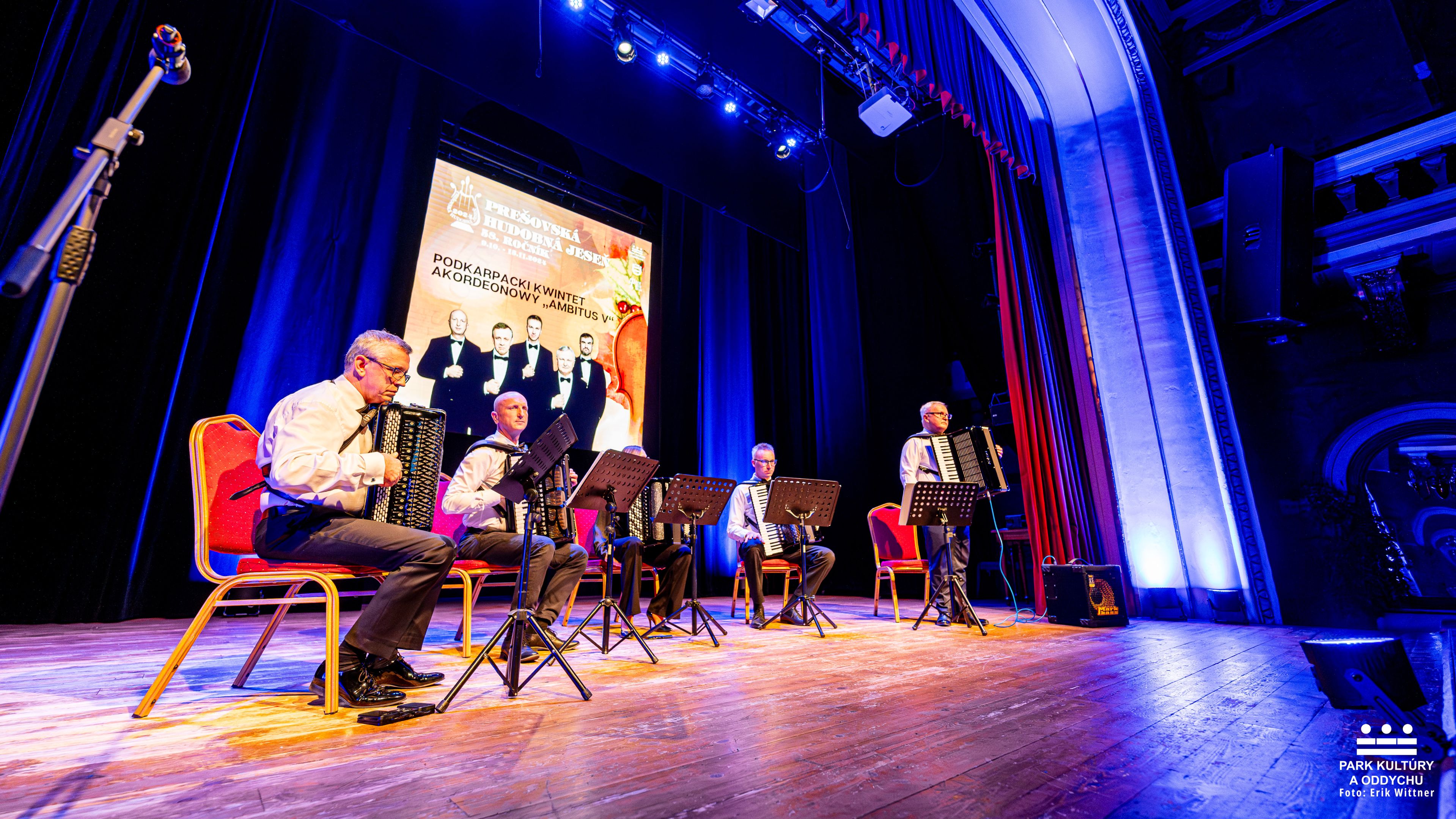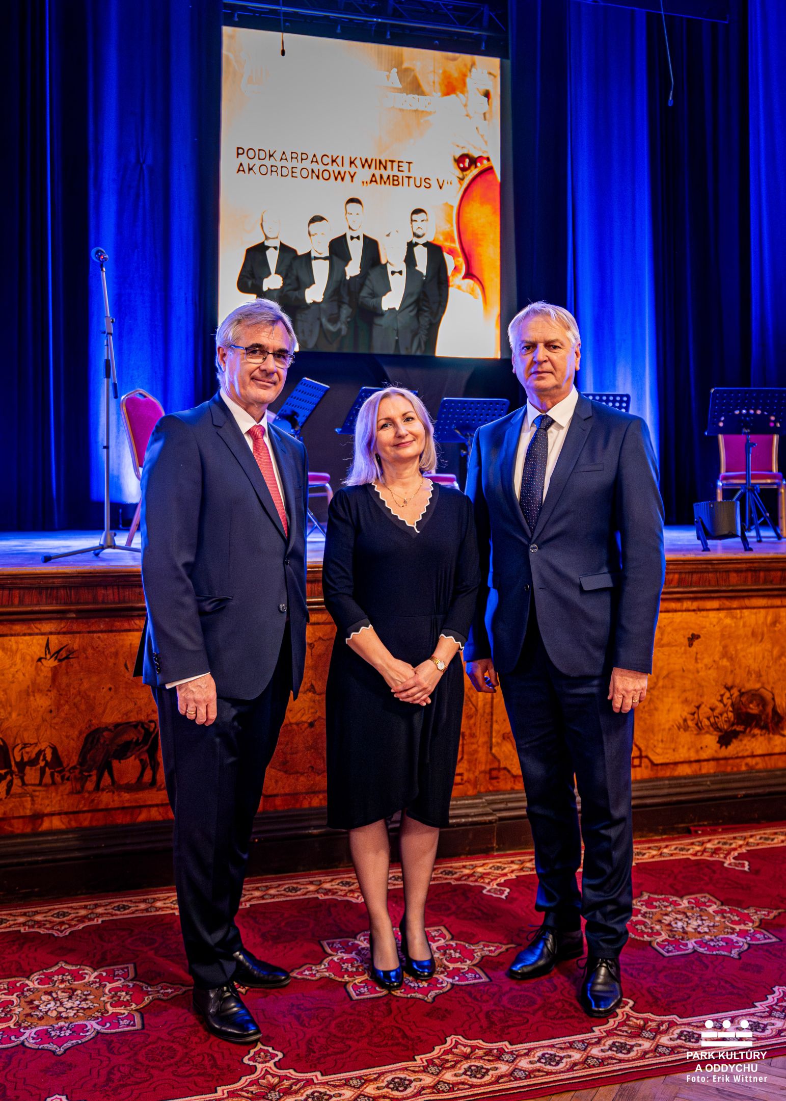 Na zaproszenie Polskiego Instytutu w Bratysławie oraz Uniwersytetu w Presovie, w ramach 9 edycji polskich dni kultury i nauki oraz 58 Preszowskiej Jesieni Muzycznej odbywającej się w terminie 9.10 -13.11.2024 r., w dn. 16 października wystąpił Podkarpacki Kwintet Akordeonowy „AMBITUS V”, afiliowany przy Uniwersytecie Rzeszowskim, pod kierunkiem Prof. UR dr hab. Mirosława Dymona oraz wykładowców Instytutu Muzyki Uniwersytetu Rzeszowskiego; Prof. dr hab. Pawła Palucha, doktorantki mgr Weroniki Sury, mgr’ów Tomasza Blicharza i Mariusza Siuśty. Koncert odbył się w prestiżowej, historycznej Sali „Čierny orol”, wchodzącej w skład ogromnego kompleksu zabudowań pod nazwą Park kultúry a oddychu. Repertuar zespołu obejmował utwory muzyki klasycznej autorstwa J. S. Bacha, W. A. Mozarta, L. Boellmanna oraz rozrywkowej, w tym tanga Astora Piazzzolli, Jacoba Gade, Issaca Albeniza, Tadeusza Kwiecińskiego. W programie pojawił się także utwór Karola Mednanskiego – Epitafium dla Ireny, który po raz pierwszy wykonano publicznie. Publiczność szczelnie wypełniła Salę koncertową liczącą ok. 200 miejsc, oklaskując i wywołując do kilku bisów Podkarpacki Kwintet Akordeonowy „AMBITUS V”. Cieszymy się bardzo, że repertuar opracowany przez członków zespołu przypadł do gustu słuchaczom, dostarczając wielu wzruszeń i estetycznych przeżyć preszowskim melomanom. Wśród zgromadzonych gości byli m.in. Szef Misji Dyplomatycznej na Słowacji, Piotr Samerak, konsul honorowy RP w Preszowie - Jan Hudacky oraz Dziekan Wydziału Filozoficznego UP w Preszowie, prof. Beata Balogova.