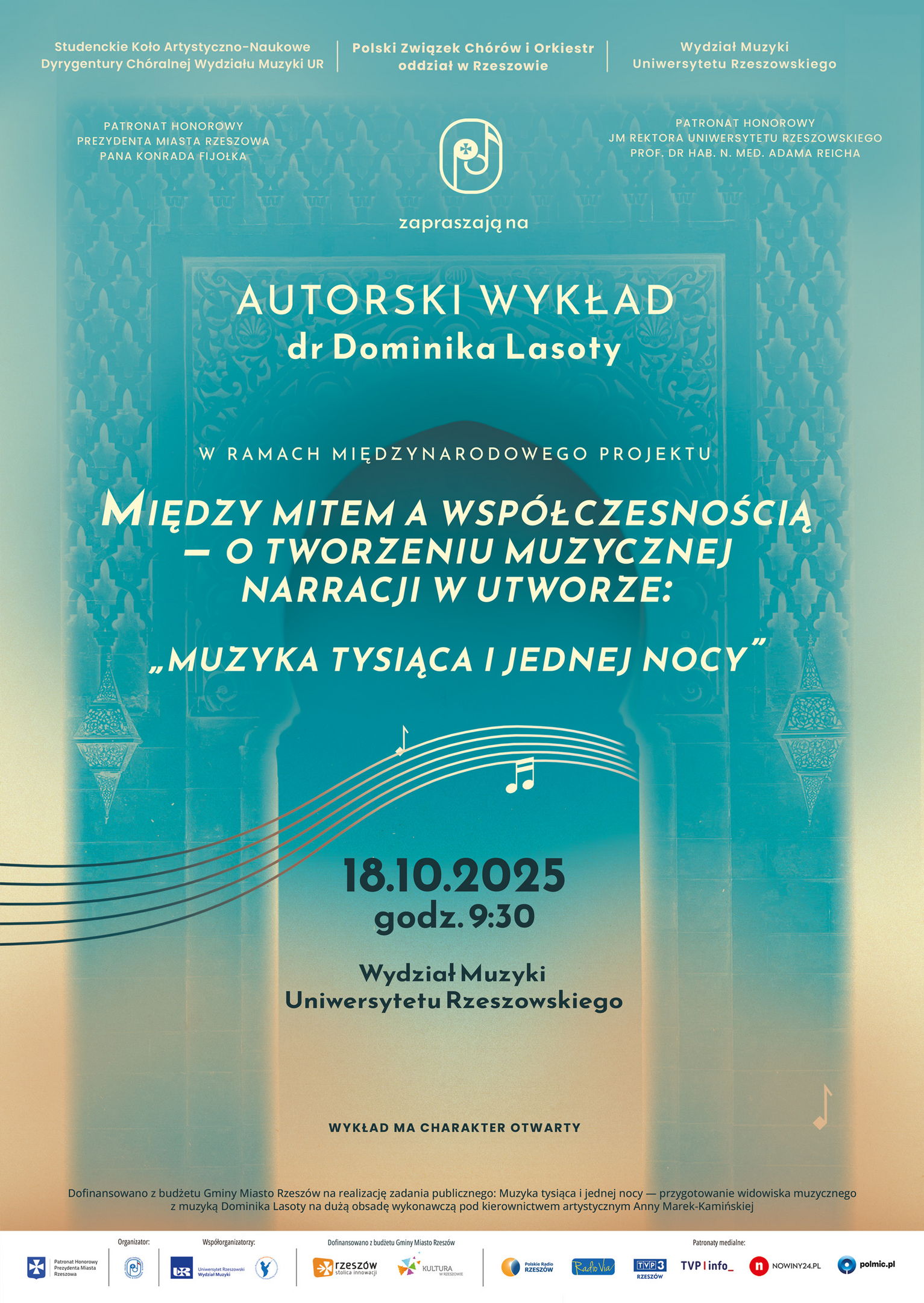 Tego samego dnia, 18 października o godz. 9:30, zaplanowano również autorski wykład dr Dominika Lasoty pt. „Między mitem a współczesnością – o tworzeniu muzycznej narracji w utworze ‘Muzyka tysiąca i jednej nocy’”, który odbędzie się w Wydziale Muzyki UR i będzie miał charakter otwarty.