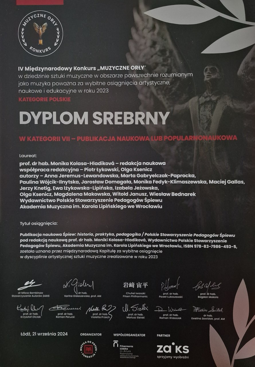 Monografia wieloautorska pt. „Śpiew. Historia, praktyka, pedagogika” Tom IV, pod redakcją naukową Prof. dr hab. Moniki Kolasy-Hladikovej, wydana przez: Polskie Stowarzyszenie Pedagogów Śpiewu oraz Akademię Muzyczną im. Karola Lipińskiego we Wrocławiu została nagrodzona w IV edycji Międzynarodowego Konkursu „Muzyczne Orły”. Publikacja została nagrodzona srebrnym dyplomem w VII kategorii: Publikacja naukowa lub popularnonaukowa.