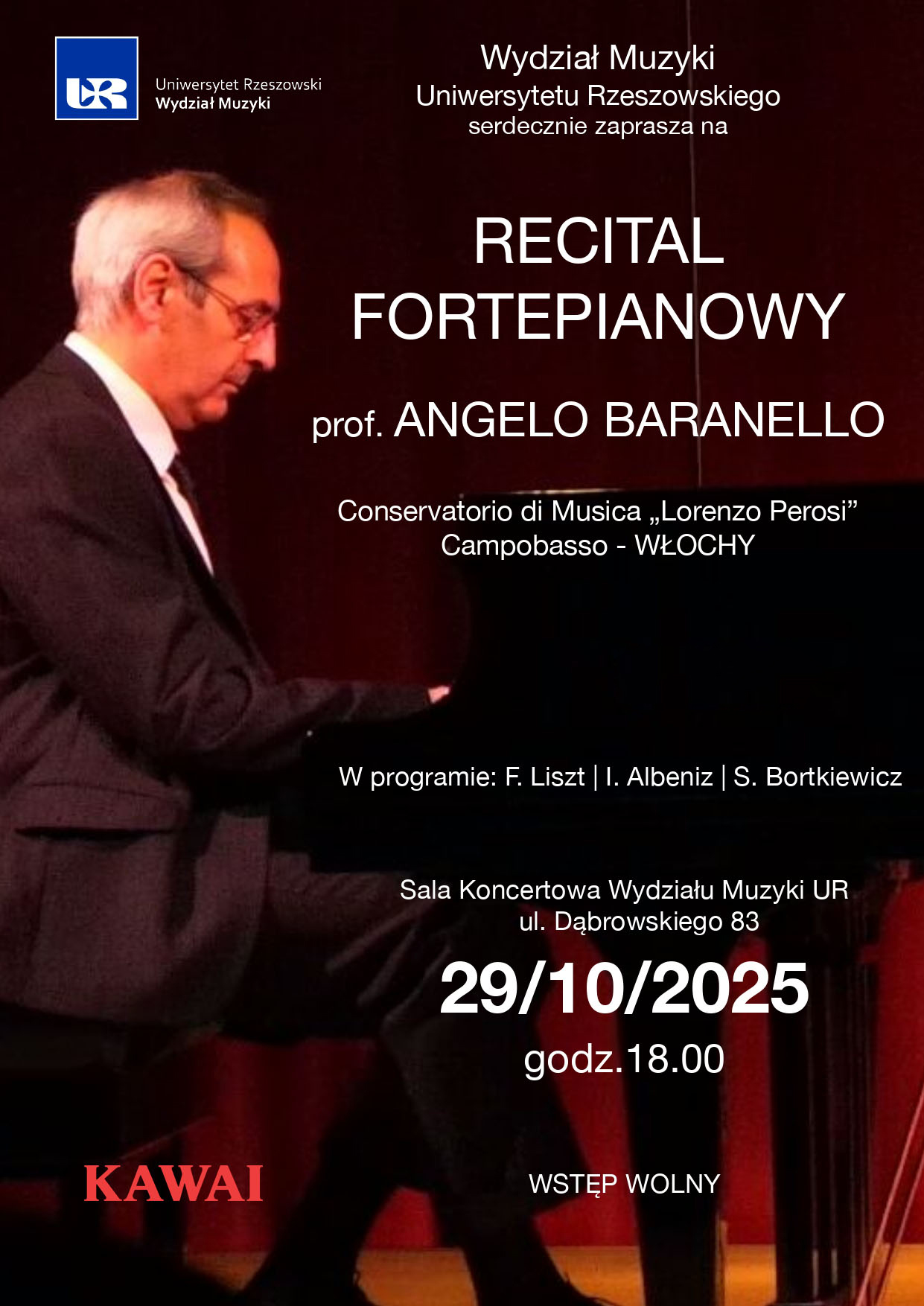 Prof. Angelo Baranello, znakomity włoski pianista i nauczyciel akademicki klasy fortepianu Konserwatorium Muzycznego im. Lorenzo Perosi w Campobasso. Studia pianistyczne ukończył z wyróżnieniem w klasie profesor Carmen Mazzarino i maestro Massimo Bertucci. Jest również absolwentem Wydziału Filozofii i Literatury na Uniwersytecie w Bolonii w zakresie Dyscyplin Sztuki i Muzyki. Laureat wielu konkursów pianistycznych, brał udział w prestiżowych festiwalach muzycznych, występował jako solista, kameralista, z orkiestrami we Włoszech, Szwajcarii, Niemczech, USA, Chorwacji i na Węgrzech, jego występy były transmitowane przez RAI, JRTV i HRTV.