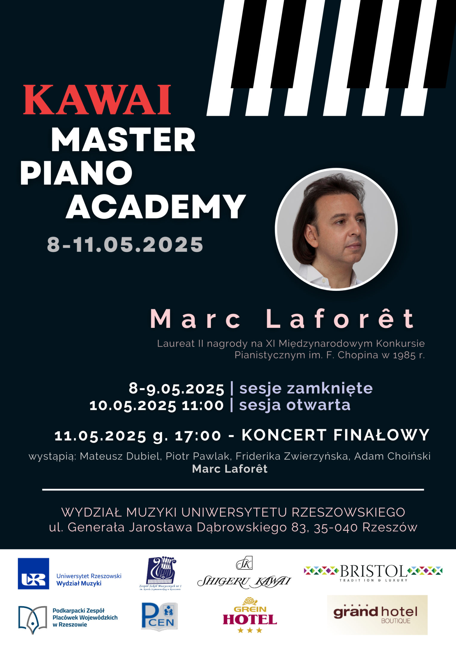 Wymienieni pianiści wezmą udział w kursie pianistycznym prowadzonym przez M. Laforêt organizowanym przez KAWAI EUROPA GmbH – Oddział w Polsce we współpracy z Wydziałem Muzyki Uniwersytetu Rzeszowskiego w ramach projektu KAWAI MASTER PIANO ACADEMY – wyjątkowe kursy mistrzowskie dla młodych pianistów!