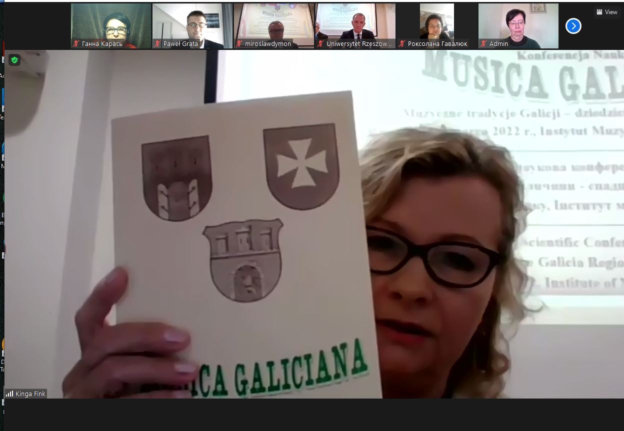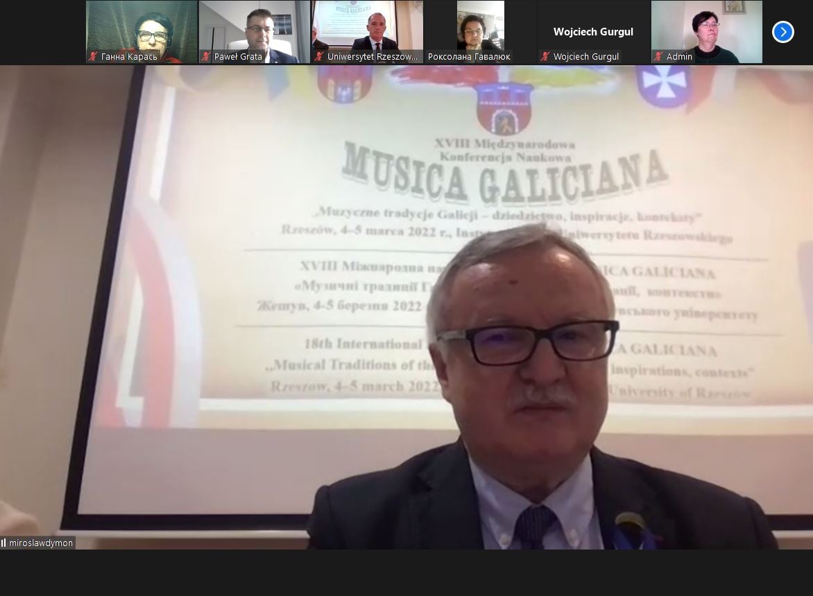 Uczestników konferencji powitali prof. dr hab. Paweł Grata, Prorektor ds. Kolegium Nauk Humanistycznych Uniwersytetu Rzeszowskiego oraz dr hab. Mirosław Dymon, prof. UR, Dyrektor Instytutu Muzyki. Kolegium Nauk Humanistycznych Uniwersytetu Rzeszowskiego, którzy przede wszystkim życzyli naukowcom z Ukrainy szybkiego zakończenia wojny i powrotu do własnych domów i miejsc pracy. Pierwszy dzień prezentacji wykładów podzielony został na trzy, tematycznie określone sesje. Pierwszą z nich: „Na styku kultur: tradycje muzyczne narodów zamieszkujących teren Galicji” poprowadziła prof. dr hab. Magdalena Dziadek (Instytut Muzykologii UJ w Krakowie). Kolejna, moderowana przez prof. dr. hab. Piotra Dahliga (Instytut Muzykologii UW) część obrad dotyczyła galicyjskich wątków w biografiach twórców i wykonawców muzyki XIX i XX wieku. Nad przebiegiem trzeciej sesji pt. „Osobistości galicyjskiego świata literatury i sztuki w kręgu wzajemnych inspiracji” czuwała dr hab. Beata Bolesławska-Lewandowska, prof. Instytutu Sztuki PAN.