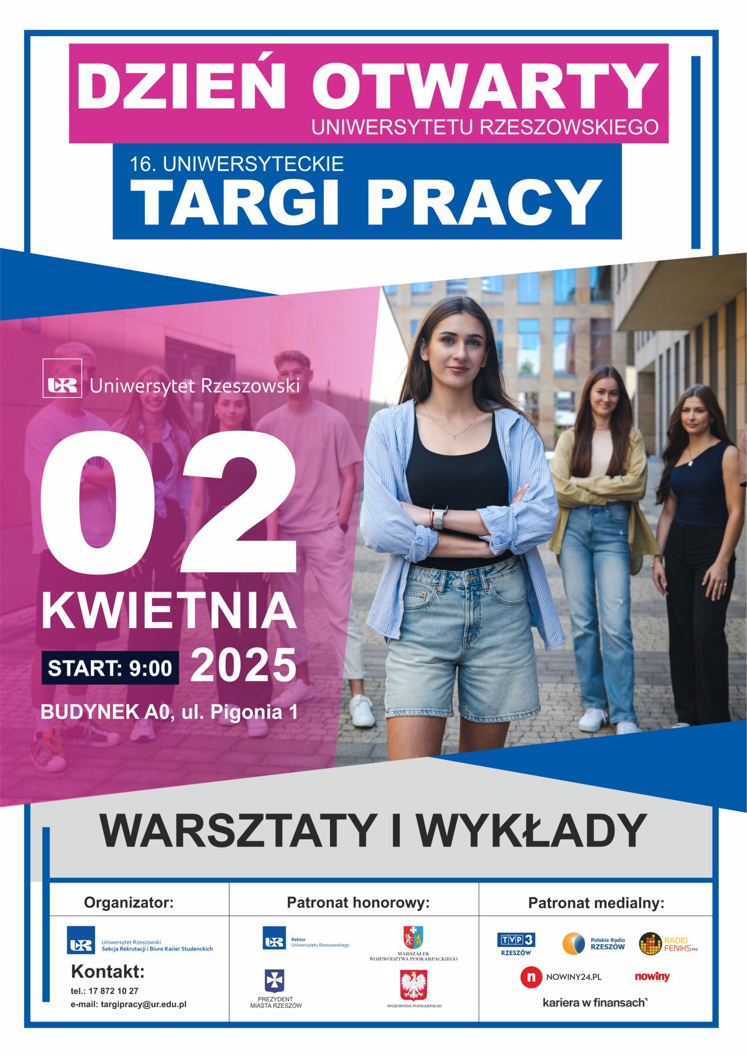 Uniwersytet Rzeszowski zaprasza na Dzień Otwarty połączony z XVI Uniwersyteckimi Targami Pracy, który odbędzie się w środę, 2 kwietnia 2025 roku, od godziny 9:00 do godziny 14:00 w budynku A0 przy ul. Pigonia 1 w Rzeszowie.