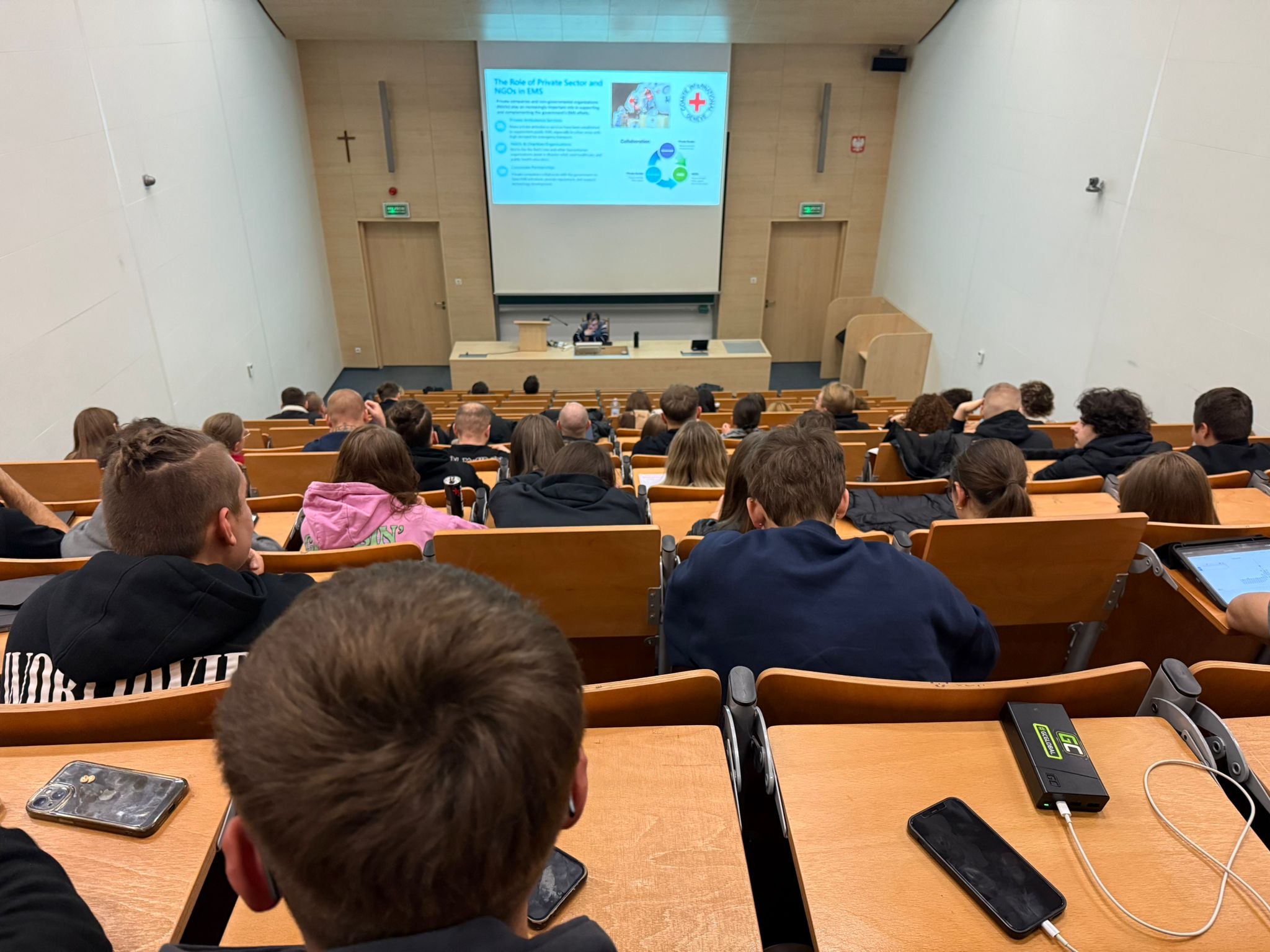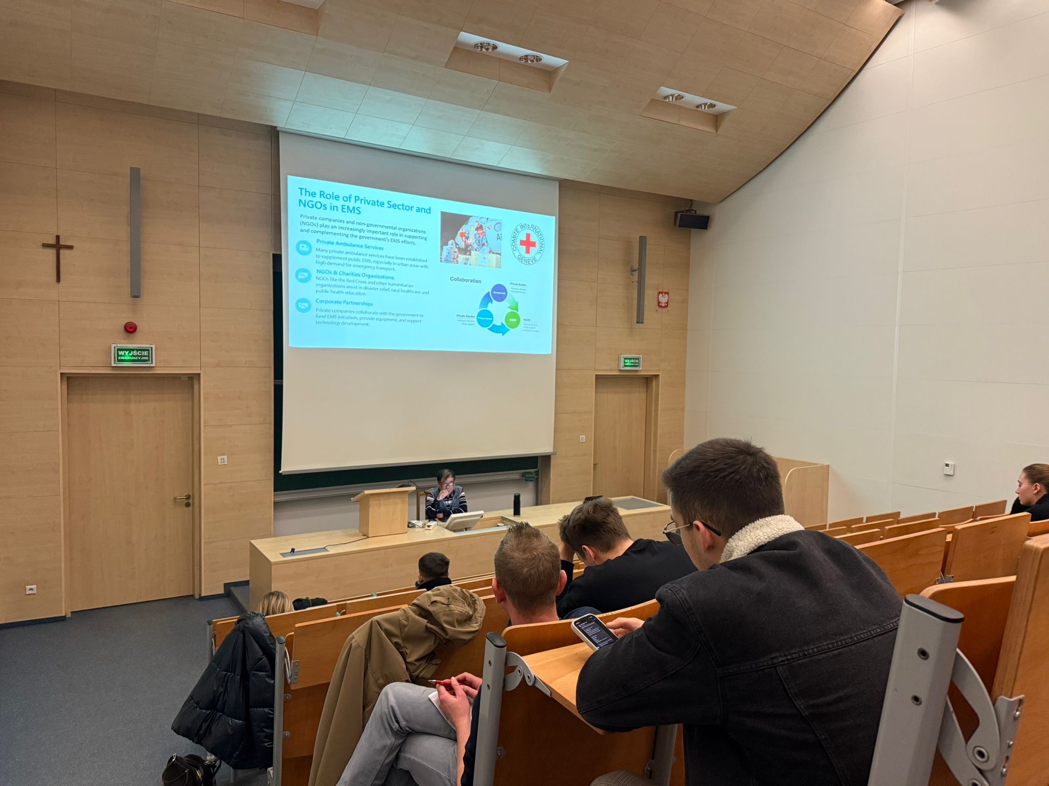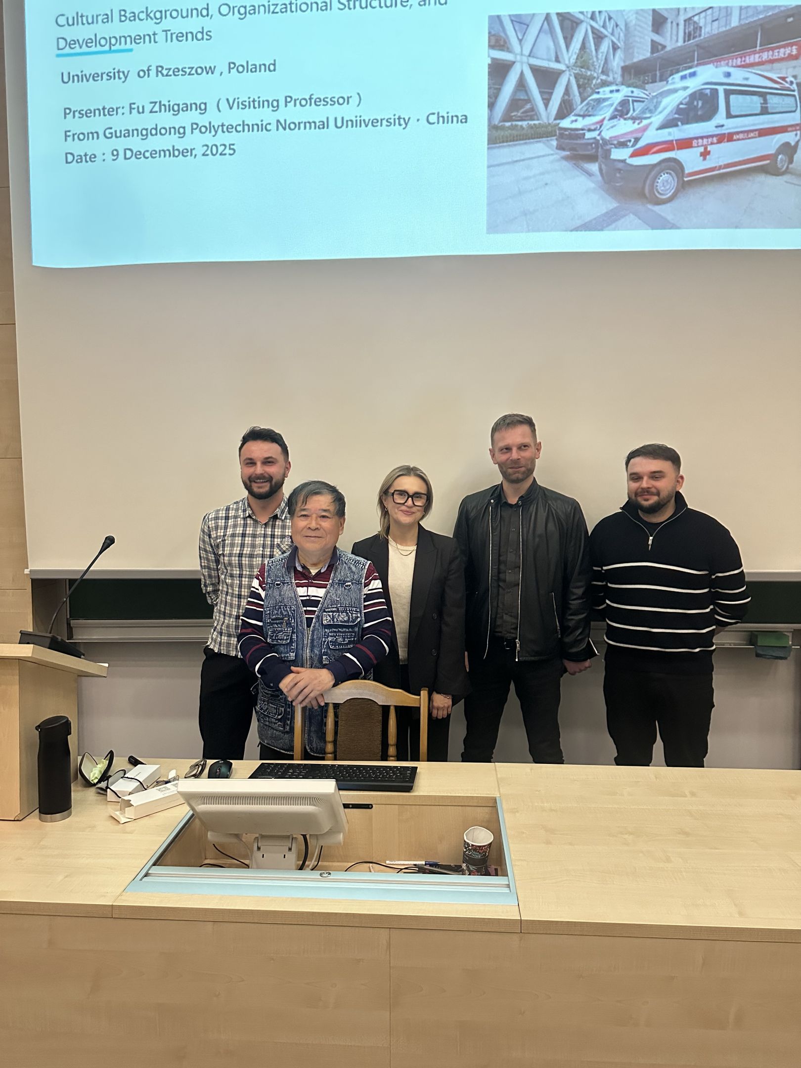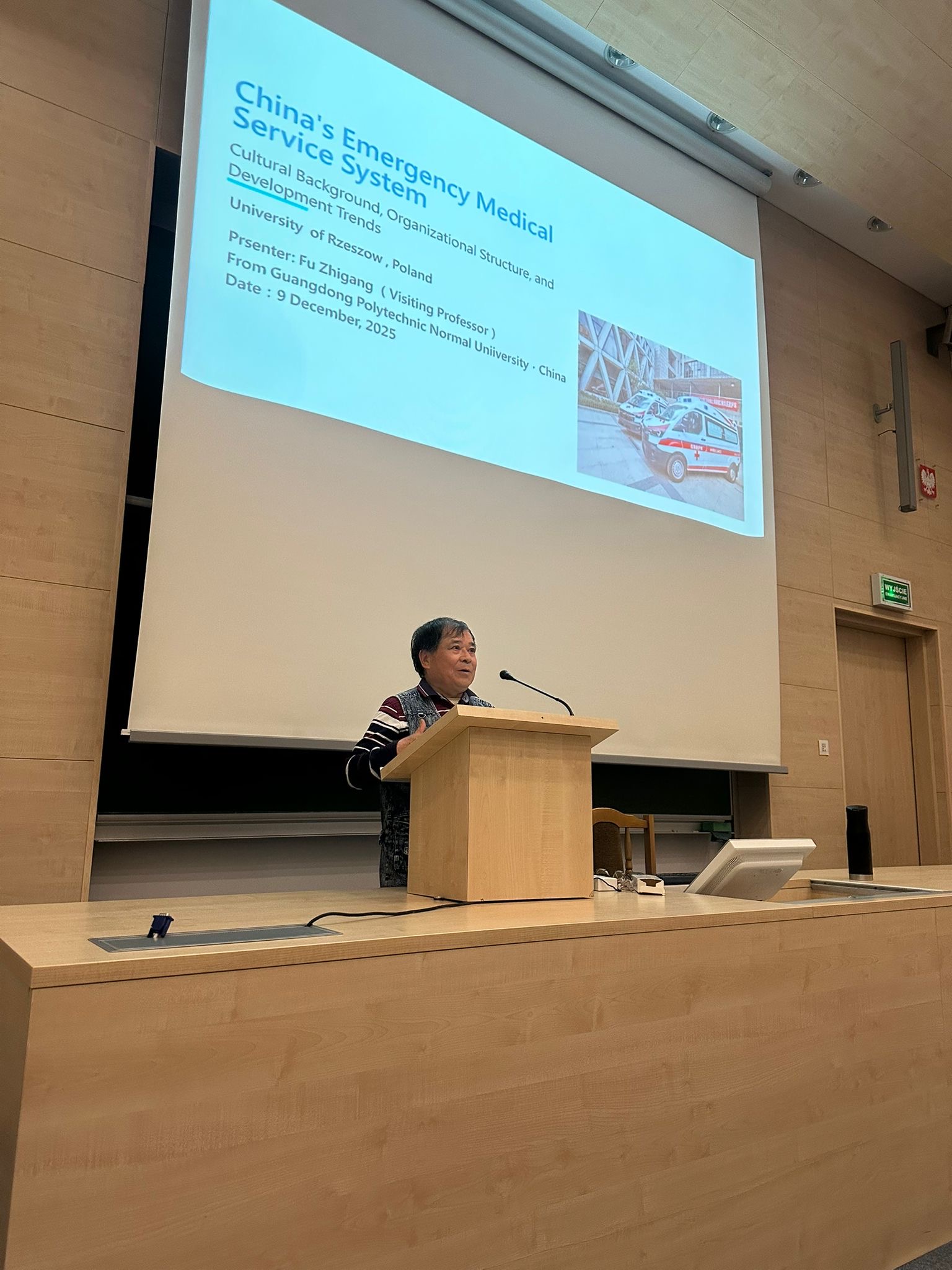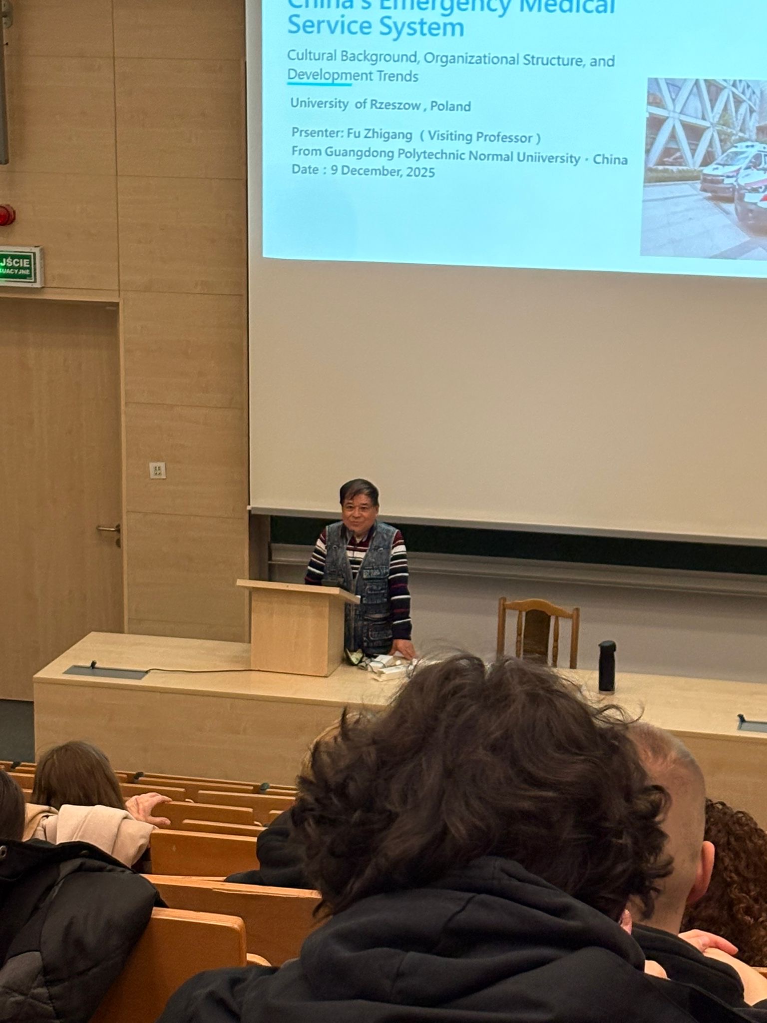Następnie prof. Fu wygłosił wykład dla studentów kierunku Ratownictwo Medyczne pt.: „China’s Emergency Medical Service System”, który spotkał się z dużym zainteresowaniem studentów. Poruszono m.in. tematykę funkcjonowania systemu ratownictwa medycznego w Chinach, jego uwarunkowań kulturowych oraz porównania z systemem europejskim.