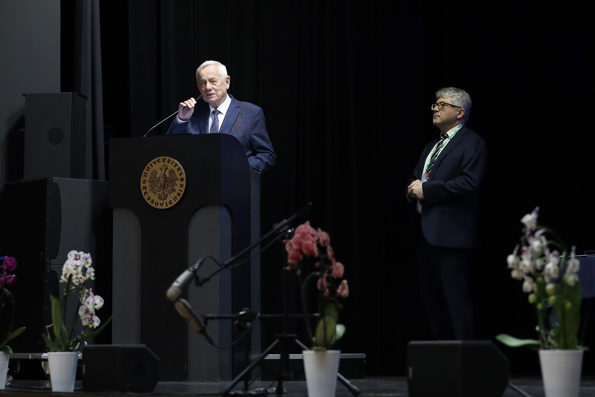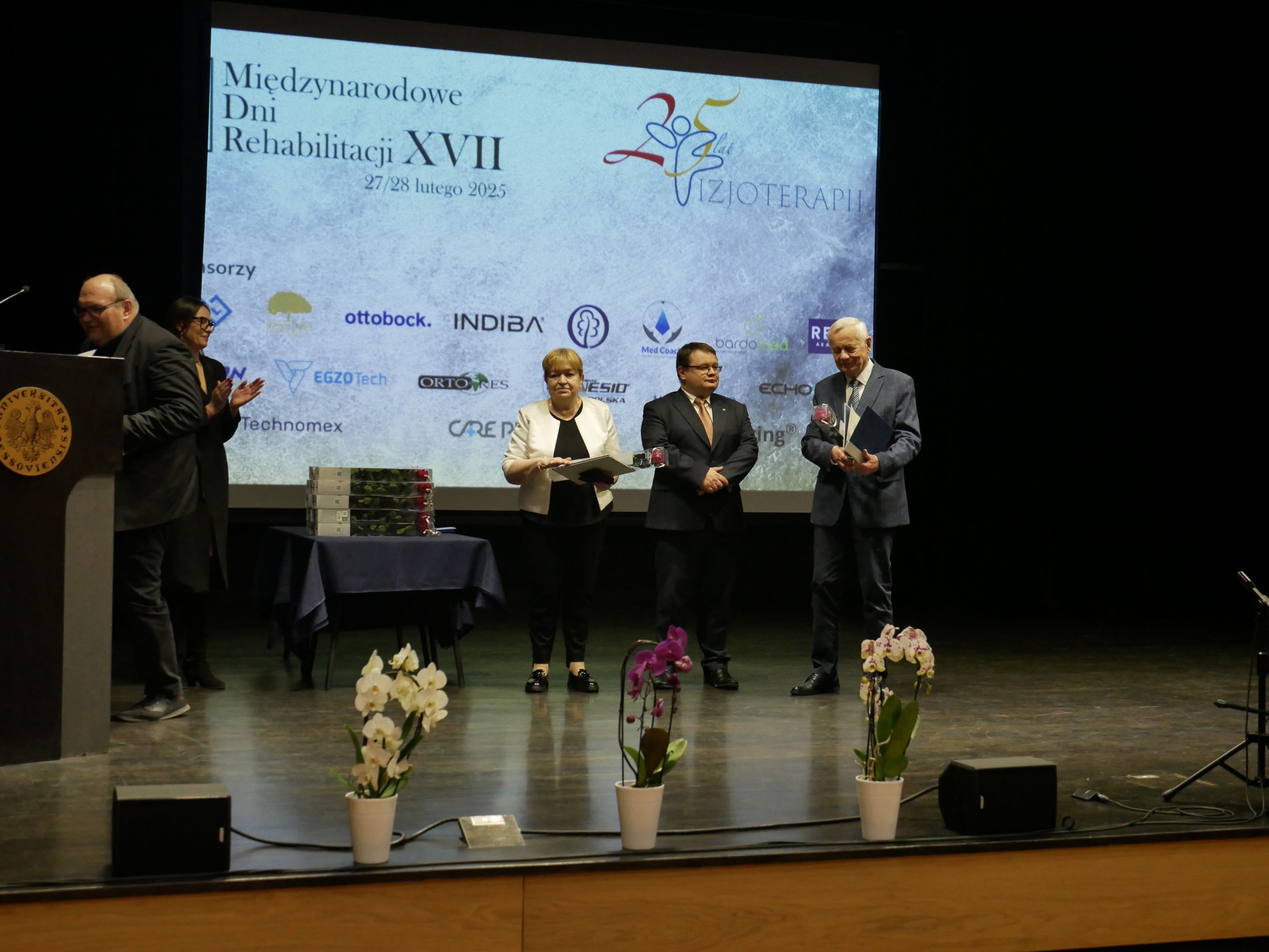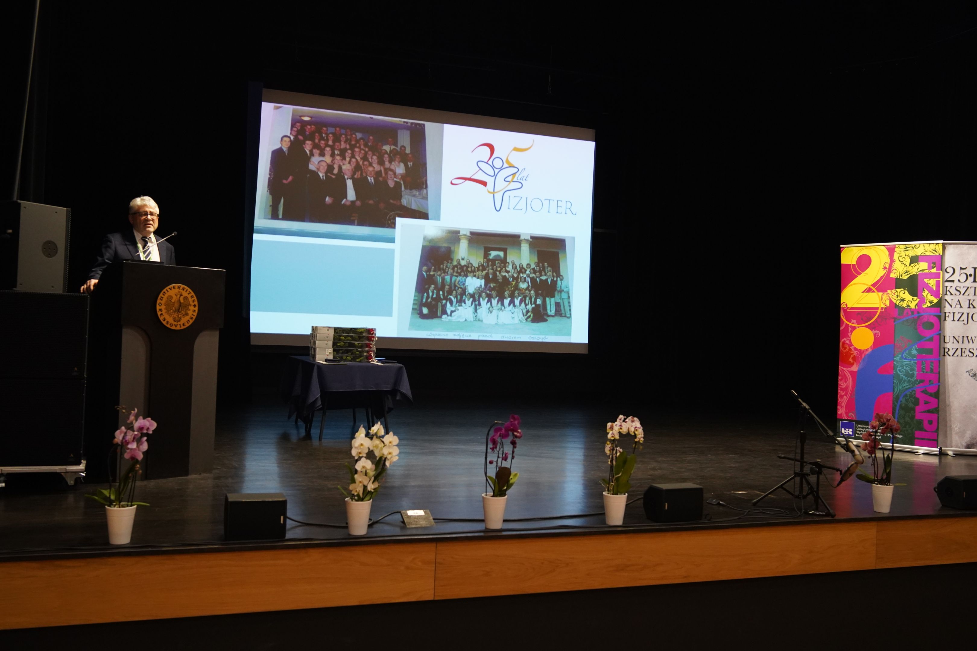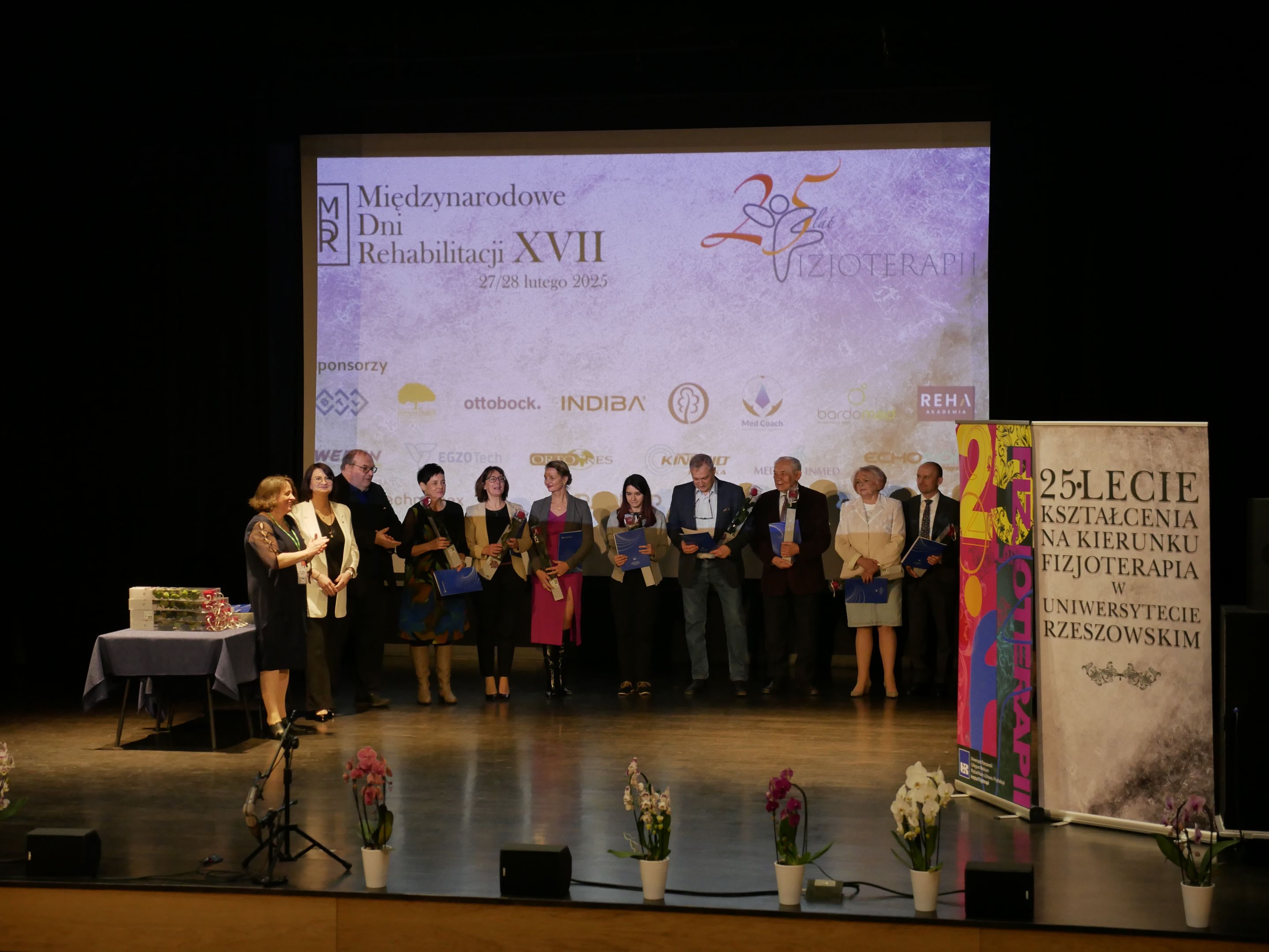 Tegorocznej Konferencji towarzyszyły obchody Jubileuszu 25-lecia kształcenia na kierunku Fizjoterapia. W uroczystości uczestniczyli m.in.: Jego Magnificencja Rektor Uniwersytetu Rzeszowskiego prof. dr hab. n. med. Adam Reich, Prorektor ds. Collegium Medicum prof. dr hab. n. med. Artur Mazur, Prorektor ds. Współpracy z Otoczeniem Społeczno-Gospodarczym prof. dr hab. Janusz Pasterski, Prorektor ds. Nauki i Współpracy Międzynarodowej prof. dr hab. Jolanta Szempruch, Jego Magnificencja Rektor Akademii Wychowania Fizycznego w Warszawie prof. dr hab. Bartosz Molik, Prorektor Warszawskiej Uczelni Medycznej im. T. Koźluka w Warszawie prof. Agnieszka Jasińska, Dziekani, Prodziekani Wydziałów Uniwersytetu Rzeszowskiego, Kanclerz Uczelni, Z-ca Dyrektora Wydziału Polityki Społecznej Podkarpackiego Urzędu Wojewódzkiego Pani Maria Gnap, Rzecznik Osób z Niepełnosprawnościami Wydziału Polityki Społecznej Urzędu Miasta Rzeszowa Pani Agnieszka Kaczmarczyk, Dyrektor Podkarpackiego Oddziału Narodowego Funduszu Zdrowia Pani Teresa Gwizdak oraz Rzecznik Podkarpackiego Oddziału Narodowego Funduszu Zdrowia Pan Rafał Śliż, Pani Anna Świercz z Zakładu Ubezpieczeń Społecznych, Konsultant Krajowy w dziedzinie fizjoterapii prof. dr hab. n. med. Jan Szczegielniak, Konsultant Wojewódzki w dziedzinie fizjoterapii dr n. o kult. fiz. Pana Wojciech Rusek, Konsultant Wojewódzka w dziedzinie rehabilitacji medycznej dr n. med. Ewa Lenart-Domka, Przewodnicząca Oddziału Rzeszowskiego Polskiego Towarzystwa Rehabilitacji dr n. o zdr. Olga Wolińska, Przewodniczący Podkarpackiego Oddziału Polskiego Towarzystwa Fizjoterapii dr Sławomir Jandziś, v-ce Prezes Stowarzyszenia Fizjoterapia Polska Pan Paweł Adamkiewicz. W czasie Jubileuszu przedstawiona została historia powstania kierunku oraz uhonorowano Medalem Uniwersytetu Rzeszowskiego twórców kierunku – dr hab. n o zdr. Teresę Pop, prof. UR oraz prof. dr hab. n. med. Andrzeja Kwolka. Podziękowania otrzymały również osoby, które od 25 lat angażują się pracę dydaktyczną, naukową i organizacyjną na rzecz kierunku Fizjoterapia. Uroczystość uświetnił występ Zespołu Pieśni i Tańca Uniwersytetu Rzeszowskiego „Resovia Saltans”.