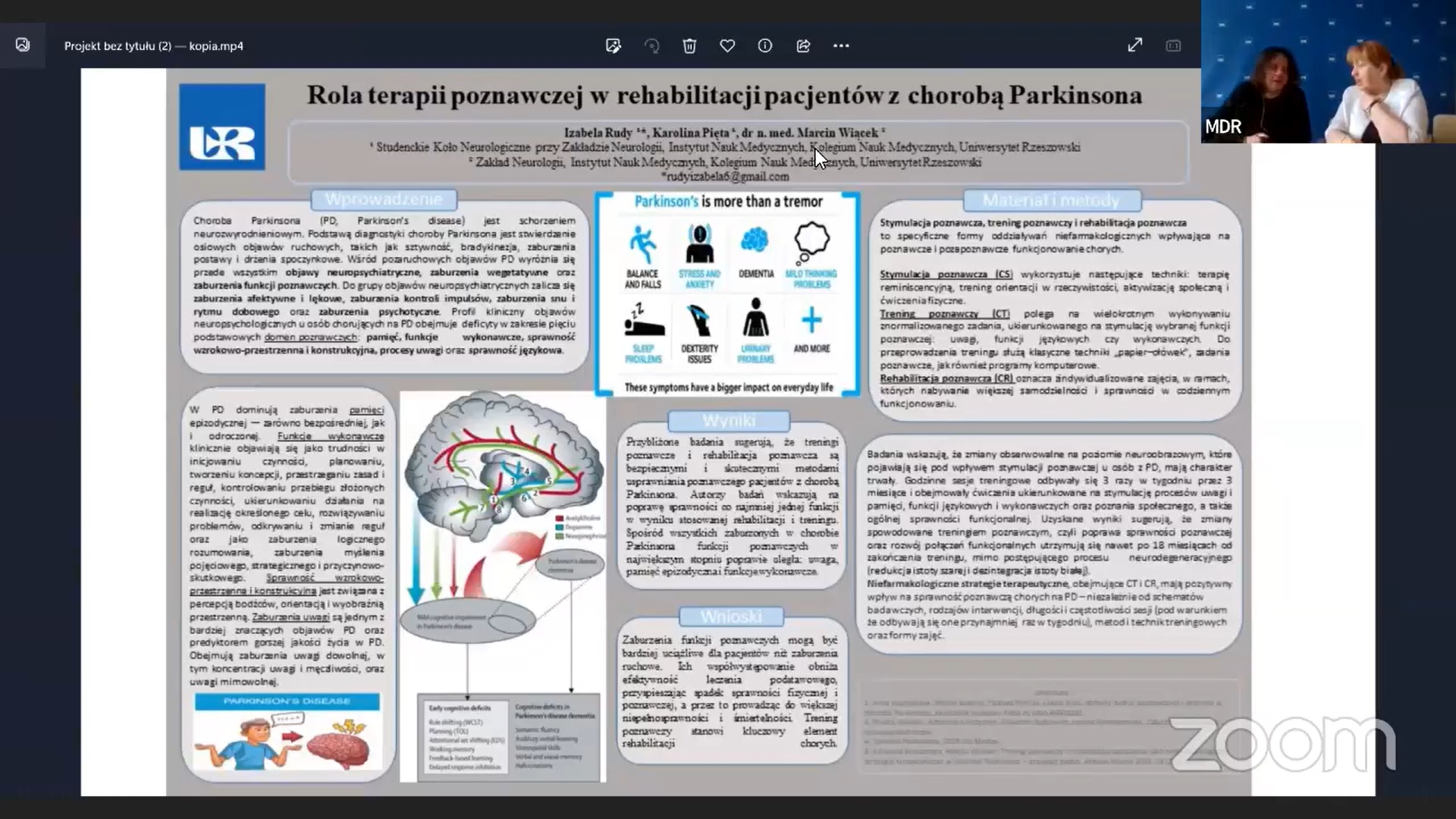 Sesja studencka I: Adamek Aleksandra, Bąk Magdalena, Bęben Michał, Błaszczak Bartosz, Błoniarz Sebastian, Bogacz Katarzyna, Bury Tomasz, Chojnacka Sara, Cmela Gabriela „Czasowe parametry chodu oraz parametry kontroli równowagi ciała osób z chorobami nieurologicznymi – przegląd narracyjny. (Temporal gait and body balance control parameters of people with neurological diseases - a narrative review.)” (Rzeszów, Polska)