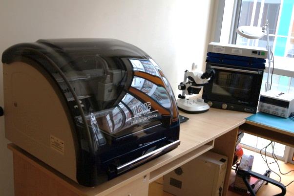 Ploter LPKF ProtoMat S63, naświetlarka UV, piec na gorące powietrze stacja lutownicza Pace ST50, stacja na gorące powietrze RECCO RA150 tworzą razem stanowisko do prototypowania, wytwarzania i montażu płytek elektronicznych. Urządzenia umożliwiają szybkie i bardzo dokładne wytworzenie obwodów drukowanych oraz montaż elementów elektronicznych na potrzeby badań naukowych.