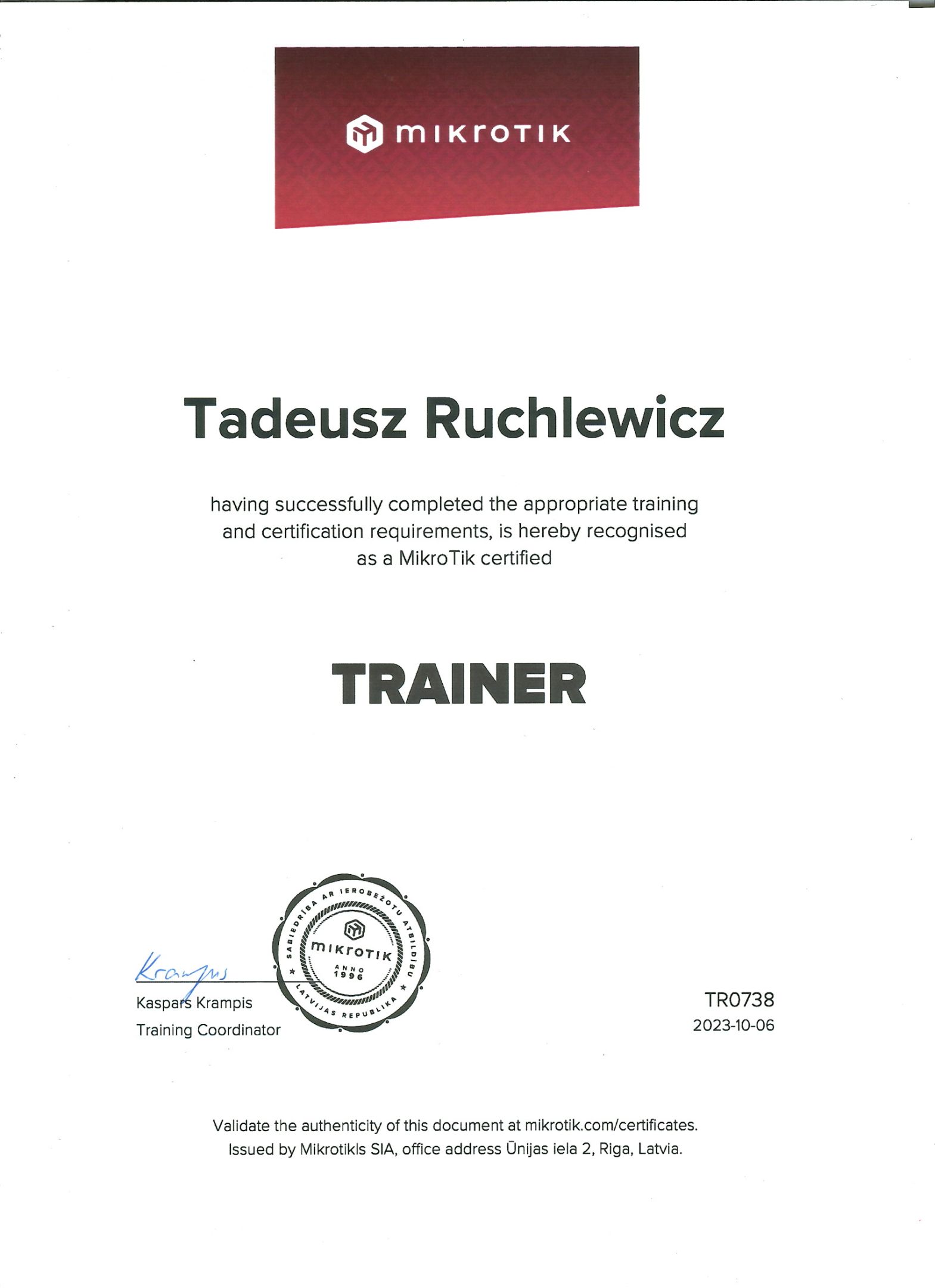 Pracownik Instytutu Informatyki mgr inż. Tadeusz Ruchlewicz certyfikowanym trenerem firmy MikroTik