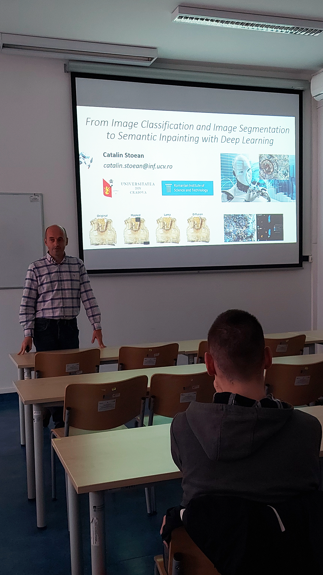 W dniach 15-19.05.2023 w Instytucie Informatyki UR, odbyła się wizyta w ramach programu Erasmus+ podczas której gościem był Prof. Catalin Stoean z University of Craiova w Rumunii. Wizyta miała charakter dydaktyczny, prof. Stoean poprowadził wykłady z dziedziny uczenia głębokich sieci neuronowych i ich zastosowań. Tytuł wykładów: „From Image Classification and Image Segmentation to Semantic Inpainting with Deep Learning”. Tematyka prezentacji związana była z badaniami nad zastosowaniem deep learning w diagnostyce medycznej, analizie artefaktów archeologicznych oraz w rekonstrukcji obrazów.