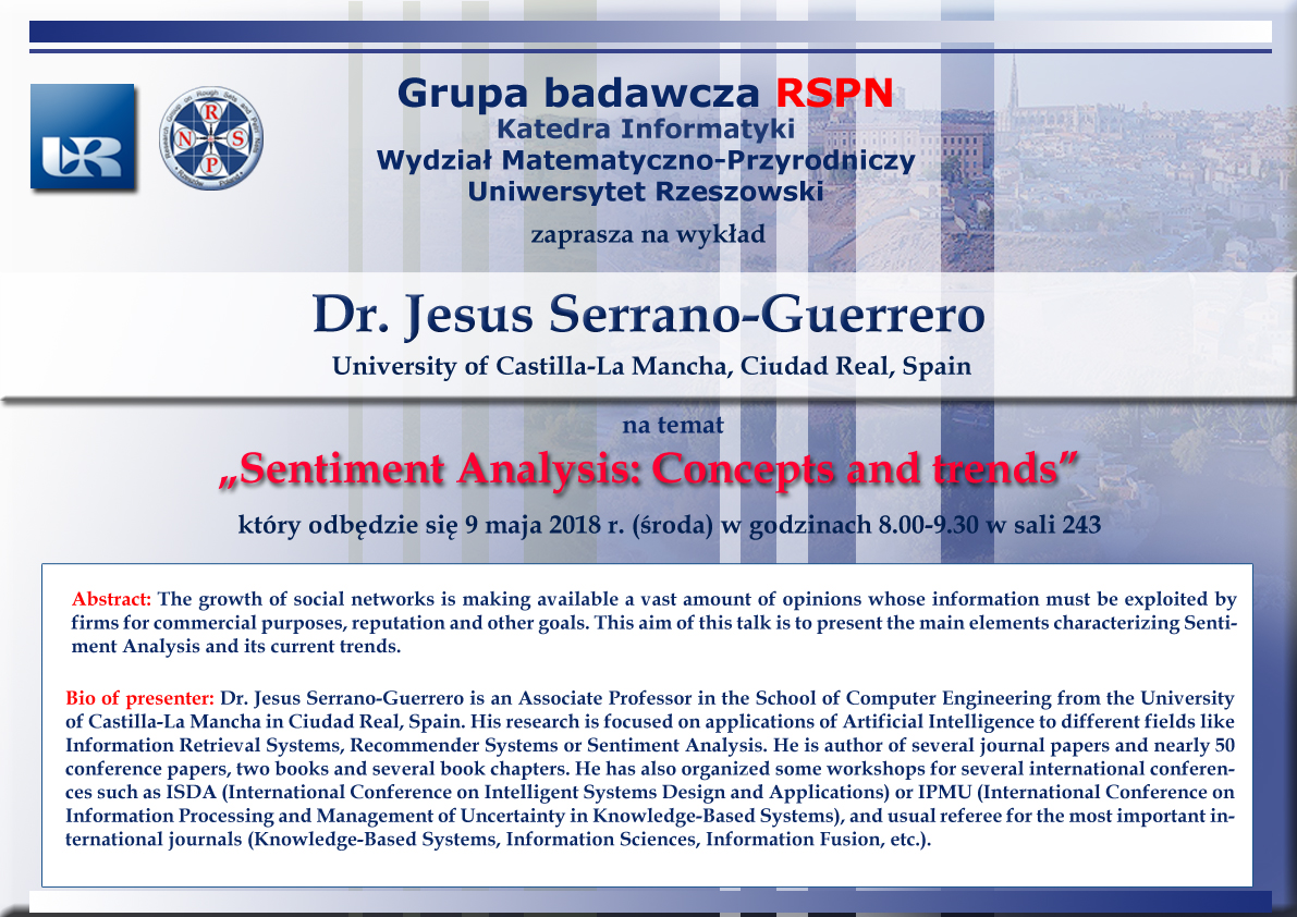May 9, 2018, Dr. Jesus Serrano-Guerrero, University of Castilla-La Mancha, Ciudad Real, Spain, "Sentiment Analysis: Concepts and trends"