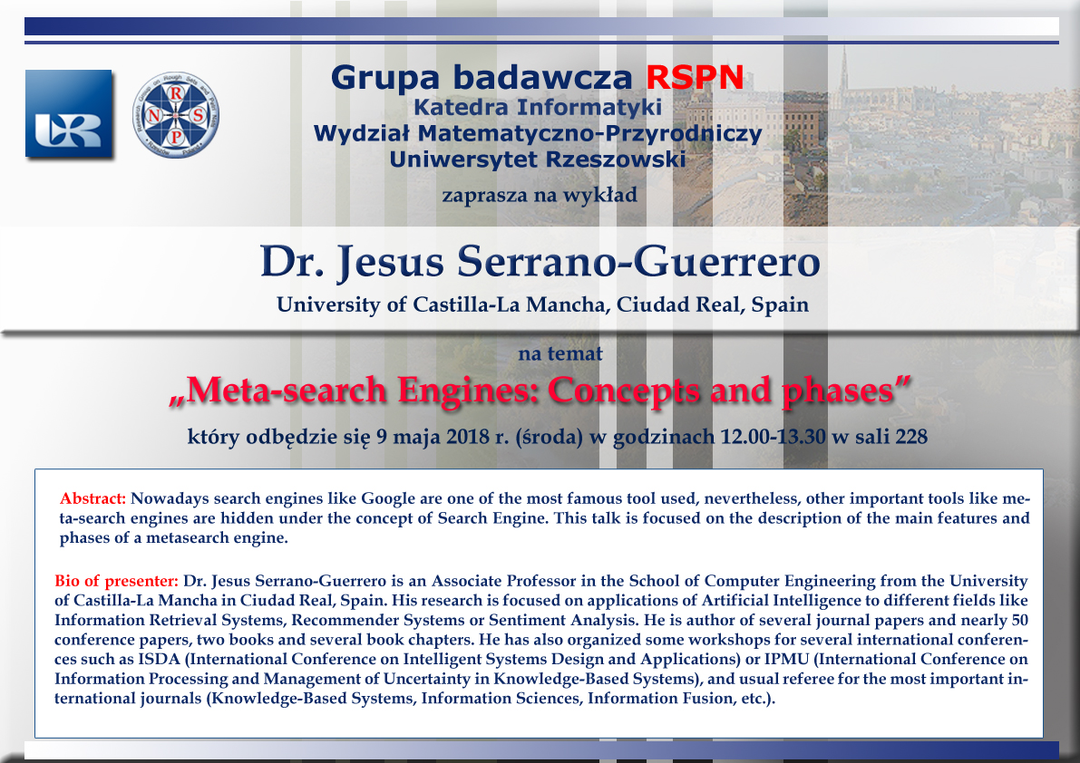 May 9, 2018, Dr. Jesus Serrano-Guerrero, University of Castilla-La Mancha, Ciudad Real, Spain, "Meta-search Engines: Concepts and phases"
