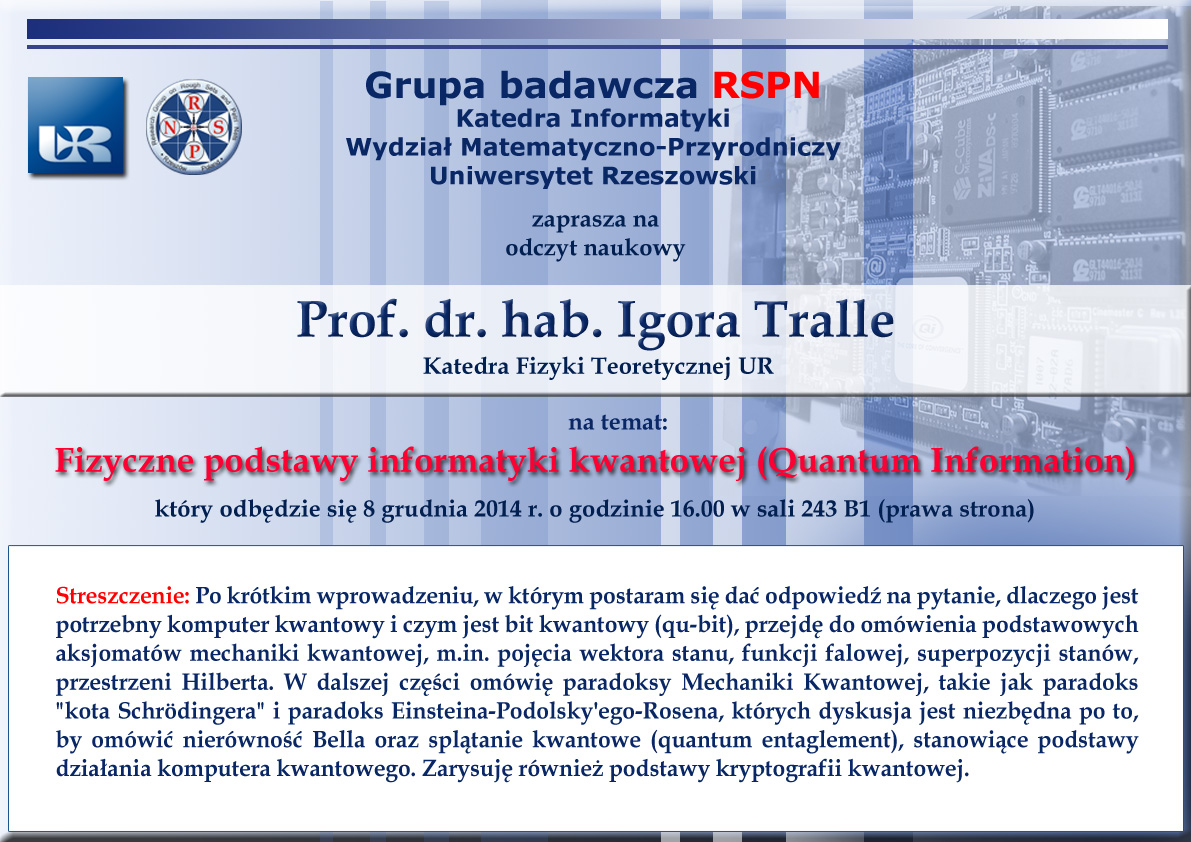 08.12.2014, prof. Igor Tralle, Katedra Fizyki Teoretycznej UR „Fizyczne podstawy informatyki kwantowej (Quantum Information)”