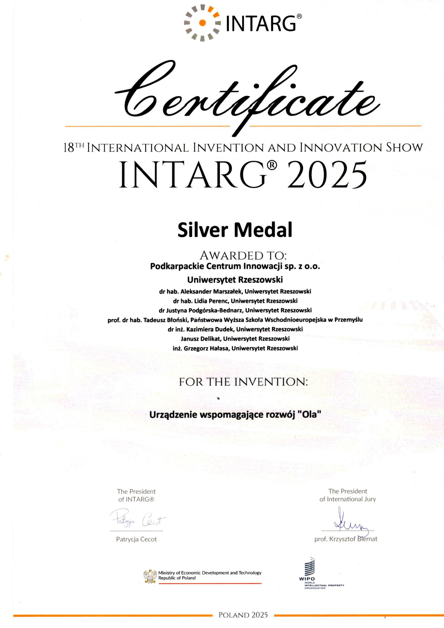 Miło nam poinformować, że dr hab. Aleksander Marszałek prof. UR wraz z zespołem został uhonorowany srebrnym medalem na Międzynarodowych Targach Wynalazków i Innowacji INTARG 2025 za realizację projektu badawczo-rozwojowego. Wręczenie medalu nastąpiło w dniu 24 czerwca 2025 r. w Podkarpackim Centrum Innowacji od przedstawicieli Władz Województwa Podkarpackiego i Podkarpackiego Centrum Innowacji.