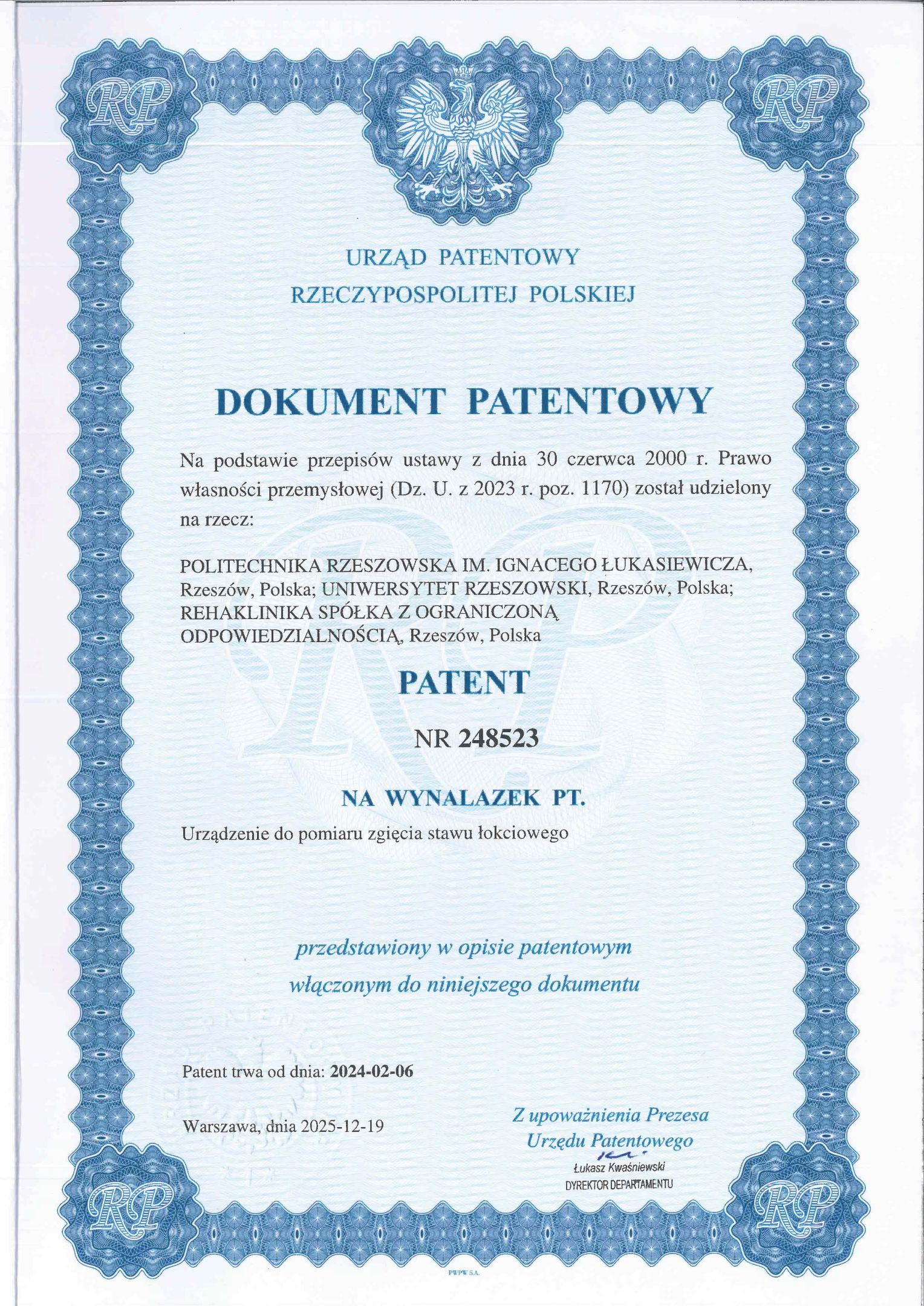 Pan dr inż. Wojciech Żyłka z Uniwersytetu Rzeszowskiego oraz naukowcy z Politechniki Rzeszowskiej uzyskali patent na wynalazek nt. Urządzenie do pomiaru zgięcia stawu łokciowego.