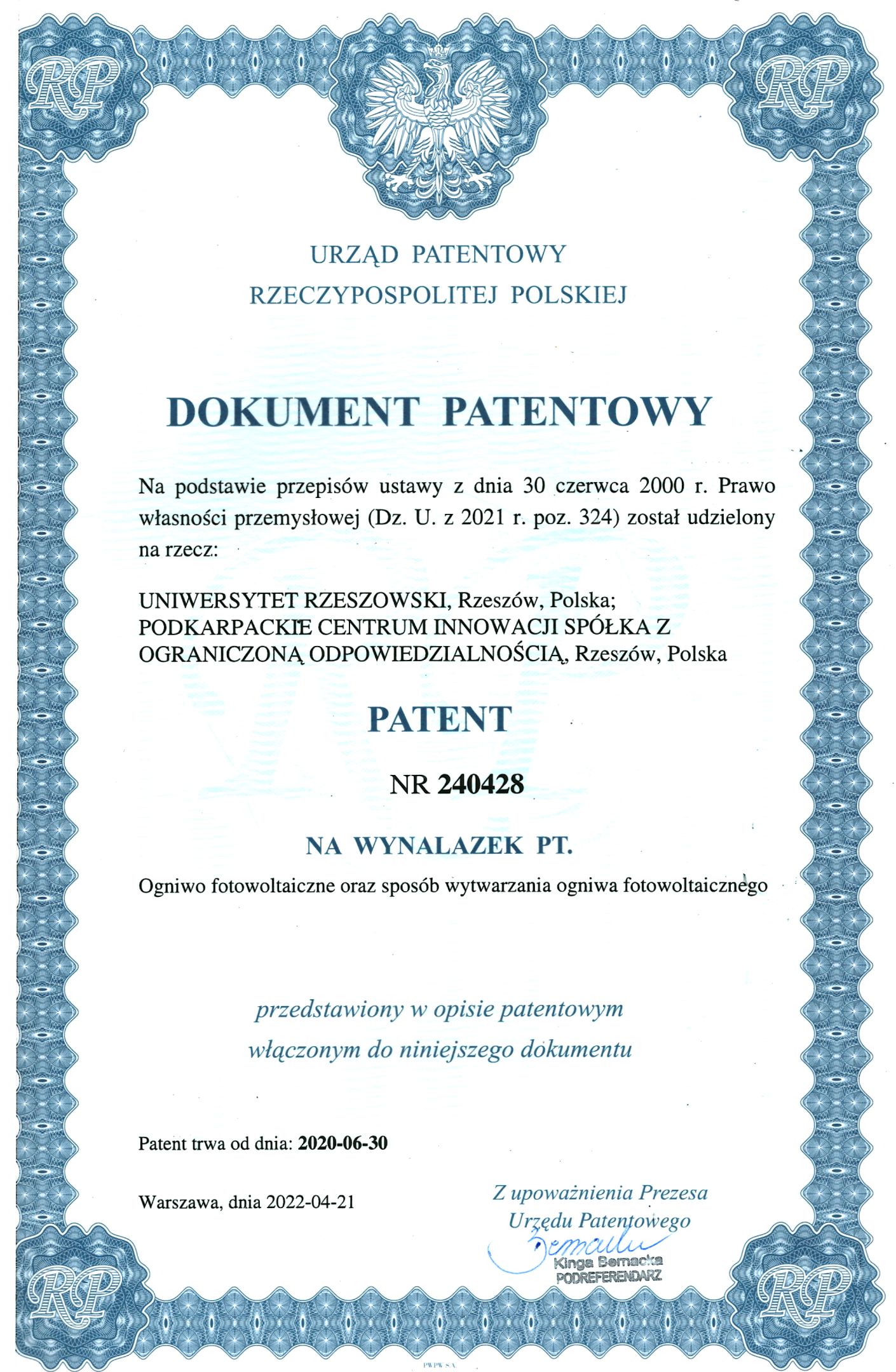 opracowali i otrzymali patent: "Ogniwo fotowoltaiczne oraz sposób wytwarzania ogniwa fotowoltaicznego”
