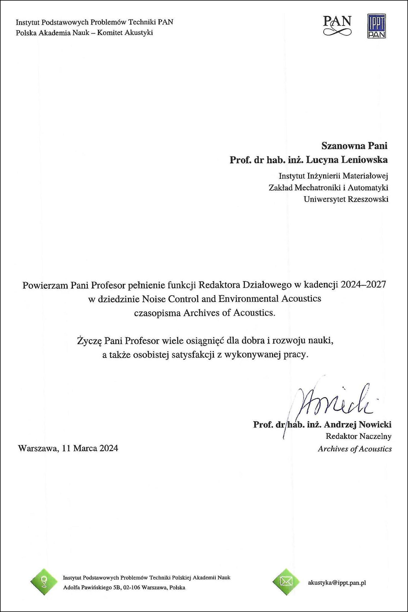 Miło nam poinformować, że Pani Prof. dr hab. inż. Lucynie Leniowskiej z Instytutu Inżynierii Materiałowej została powierzona funkcja Redaktora Działowego w kadencji 2024 - 2027 w dziedzinie Noise Control and Environmental Acoustics czasopisma Archives of Acoustics.