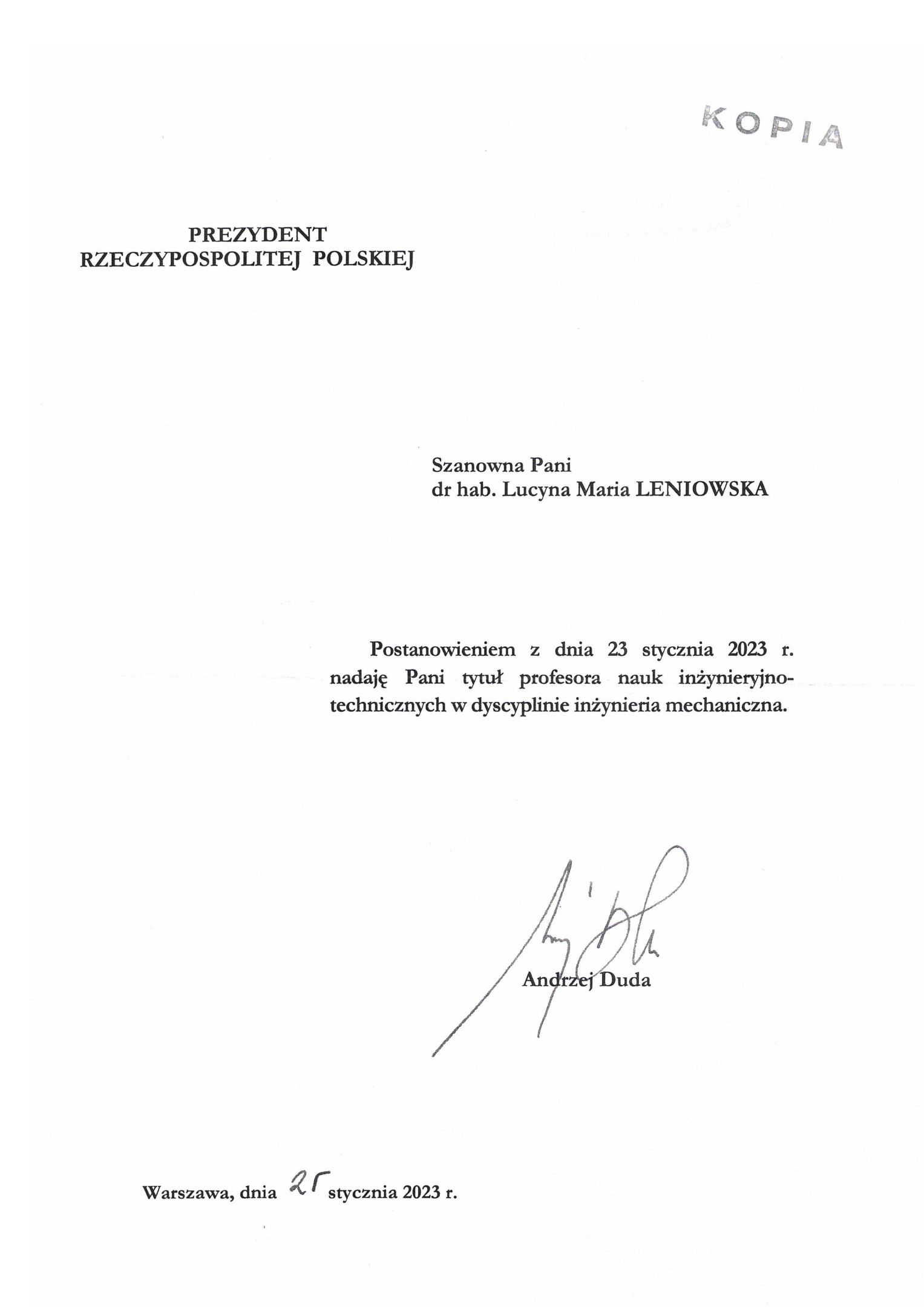 Tytuł Profesora dla Pani dr hab. inż. Lucyny Leniowskiej