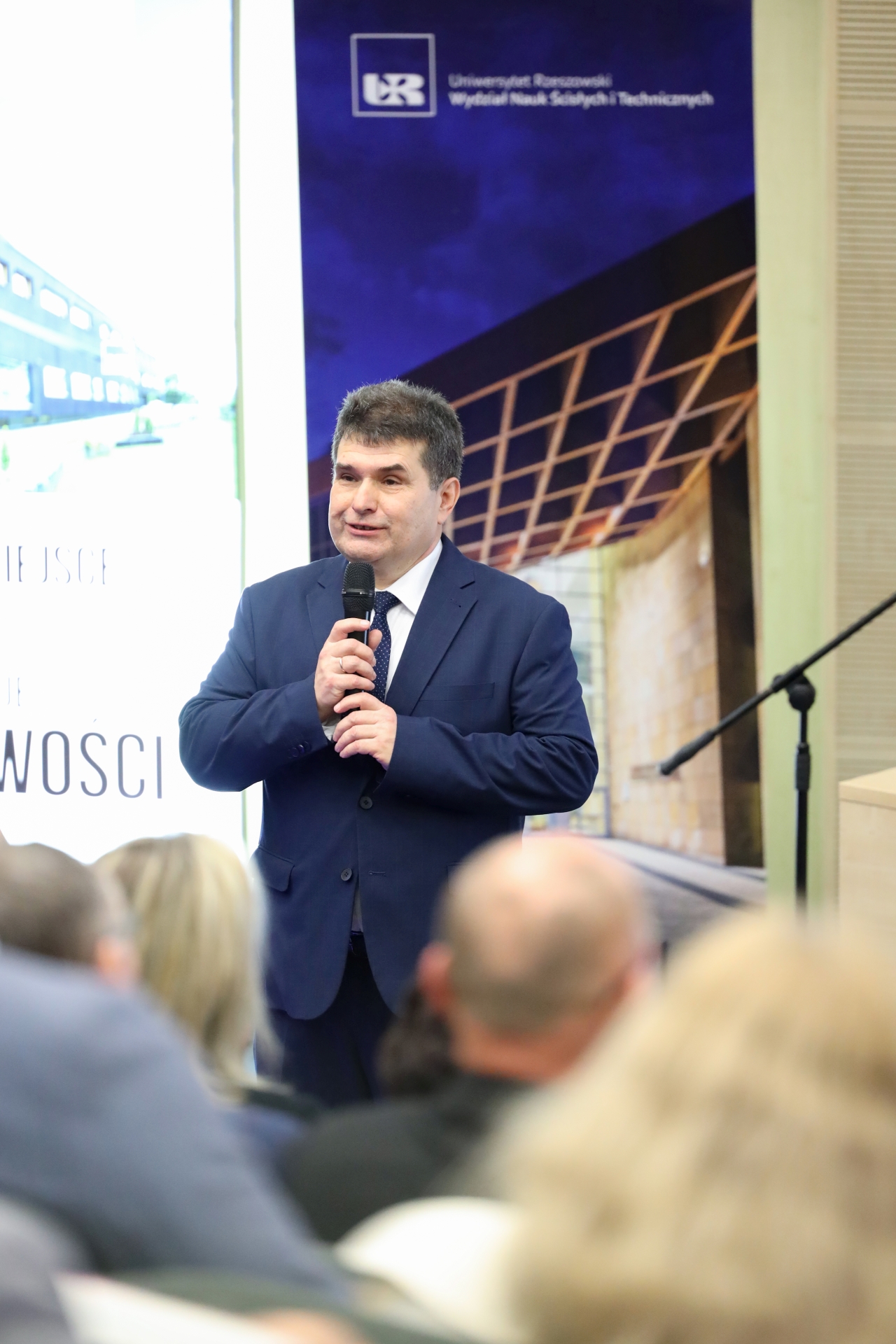 Uroczystość rozpoczęła się powitaniem gości przez Dziekan Wydziału Nauk Ścisłych i Technicznych - dr hab. Barbarę Pękalę, prof. UR. Następnie głos zabrał Rektor Uniwersytetu Rzeszowskiego - prof. dr hab. n. med. Adam Reich, który zwrócił uwagę na strategiczne znaczenie inwestycji w rozwój sztucznej inteligencji dla przyszłości nauki oraz gospodarki.