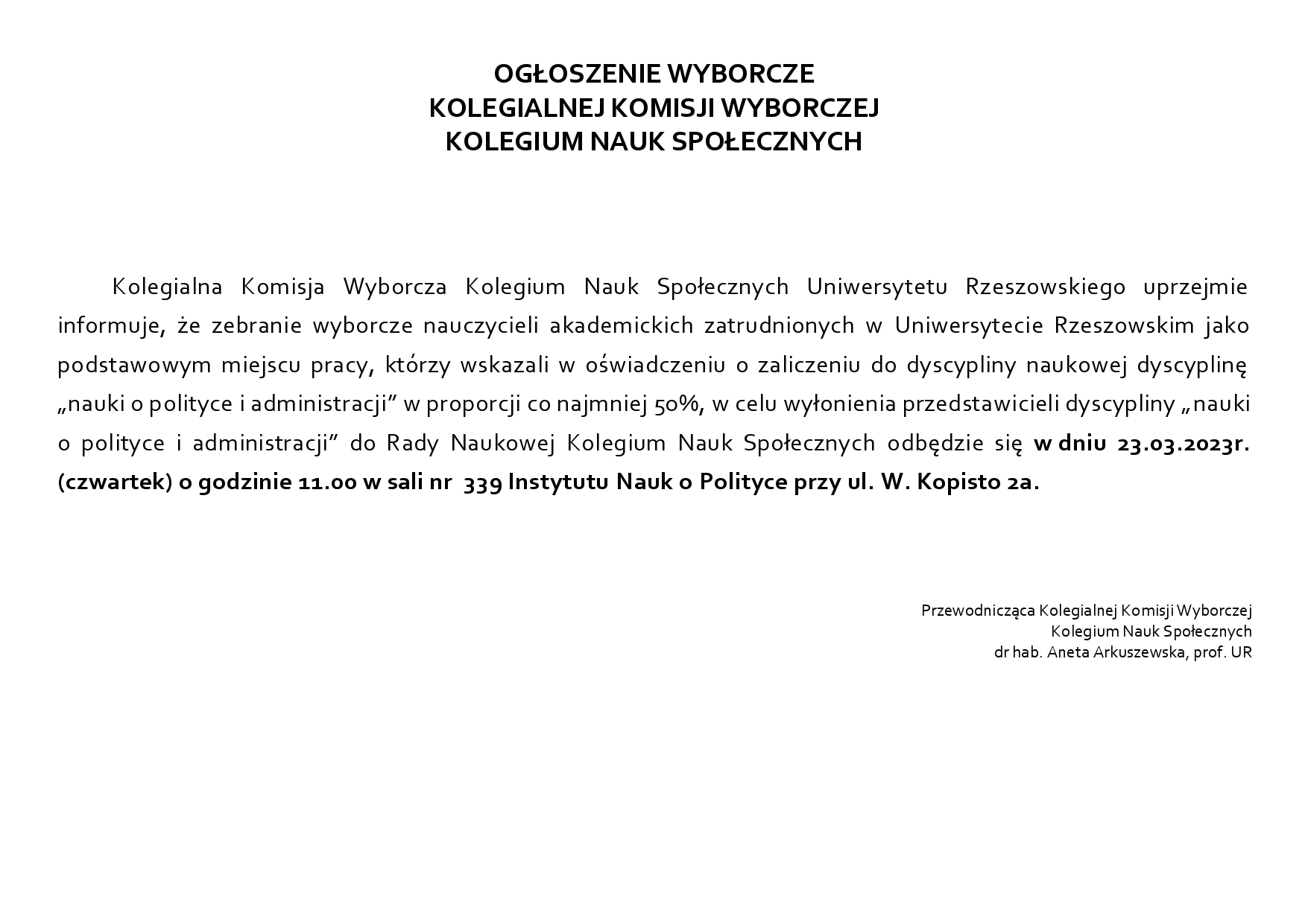 OGŁOSZENIE WYBORCZE KOLEGIALNEJ KOMISJI WYBORCZEJ KOLEGIUM NAUK SPOŁECZNYCH