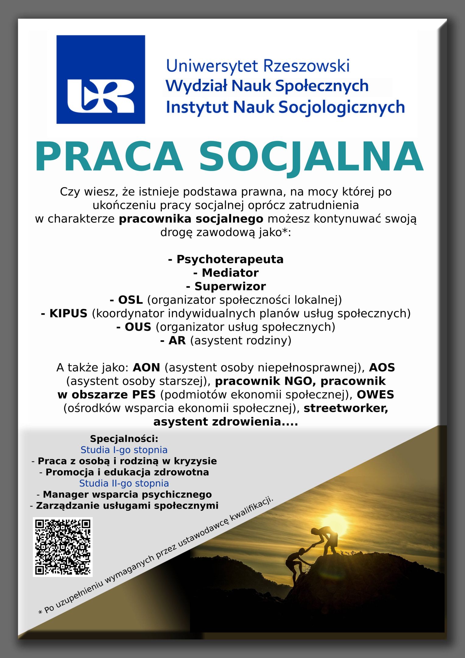 | Chcesz mieć realny wpływ na życie innych ludzi i pomagać im w codziennych problemach? Wybierz kierunek PRACA SOCJALNA na Uniwersytecie Rzeszowskim. To studia dla osób, które chcą pomagać, wspierać i działać na rzecz społeczności: od pracy z rodziną w kryzysie po działania w organizacjach społecznych i instytucjach publicznych. Po ukończeniu studiów (i uzupełnieniu kwalifikacji wymaganych przez ustawodawcę) możesz rozwijać się m.in. także jako psychoterapeuta, mediator czy superwizor. Czekają na Ciebie różnorodne ścieżki kariery: NGO, wsparcie osób starszych i z niepełnosprawnościami, a także działania w obszarze ekonomii społecznej. Wybierz studia, które mają znaczenie dla Ciebie i dla innych. |