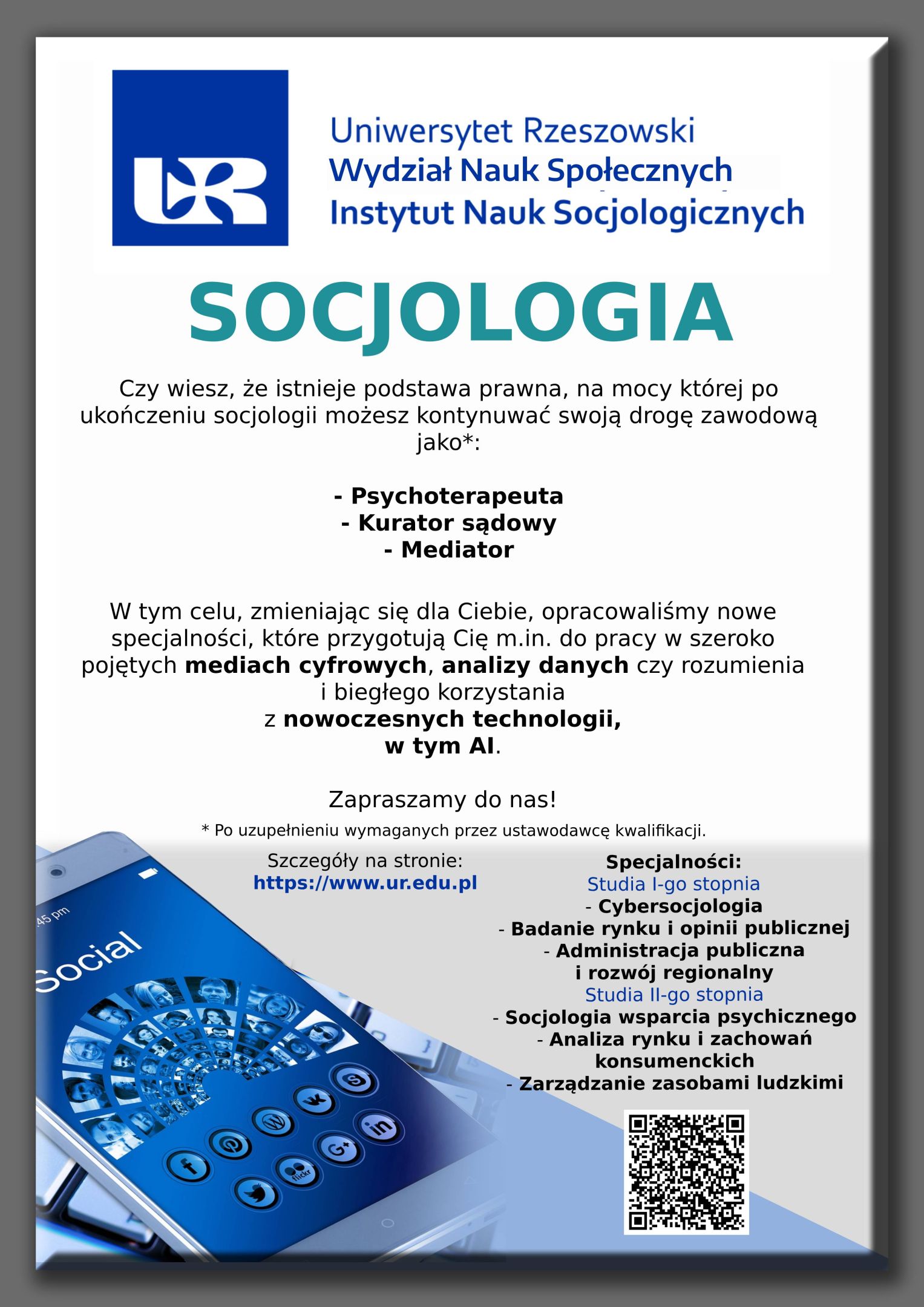 Szukasz kierunku, który daje szerokie możliwości rozwoju i pracy zawodowej? Postaw na socjologię na Uniwersytecie Rzeszowskim! Pogłębisz rozumienie relacji społecznych i procesów zachodzących w społeczeństwie a także zdobędziesz wiedzę o mediach cyfrowych i nowoczesnych technologiach (w tym AI). Co ważne, po ukończeniu studiów i uzupełnieniu wymaganych przez ustawodawcę kwalifikacji, możesz rozwijać się także w kierunku psychoterapii i pracować jako certyfikowany psychoterapeuta. Socjologia otwiera drzwi do wielu ścieżek kariery – od badań rynku po pracę z drugim człowiekiem. Otworzysz sobie drogę do pracy m.in. jako mediator, kurator czy specjalista od badań rynku. Wybierz studia, które naprawdę dają możliwości! |
