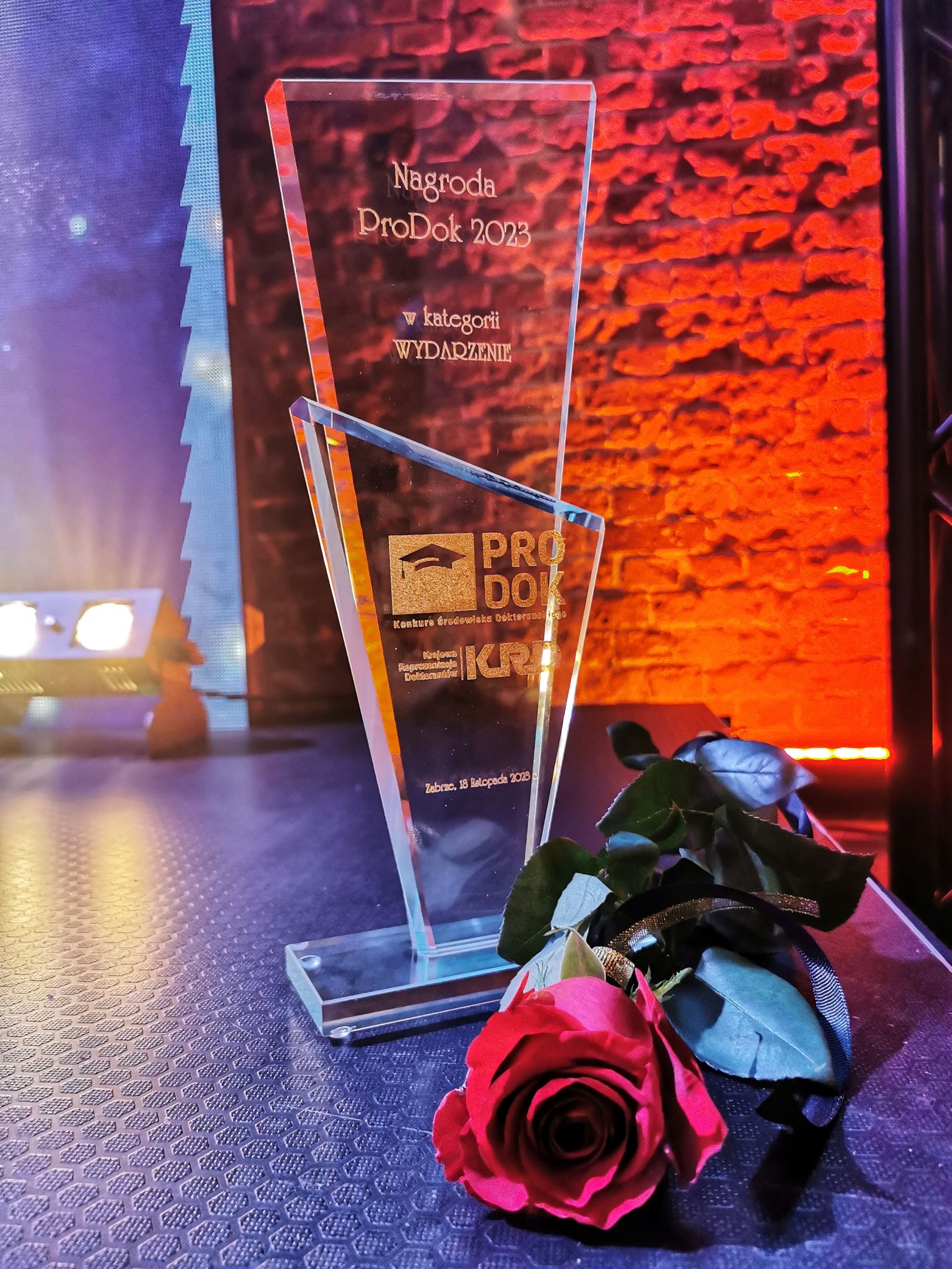 18 listopada 2023 r. Samorząd Doktorantów UR, reprezentowany przez Przewodniczącego Samorządu Doktorantów UR mgra Mateusza Śliwę oraz wykonawczynię projektu mgr Anetę Haligowską, odebrał nagrodę w Konkursie Środowiska Doktoranckiego ProDoc2023 za najlepsze zorganizowane wydarzenie – cykl spotkań i warsztatów „Zdrowy Senior”.