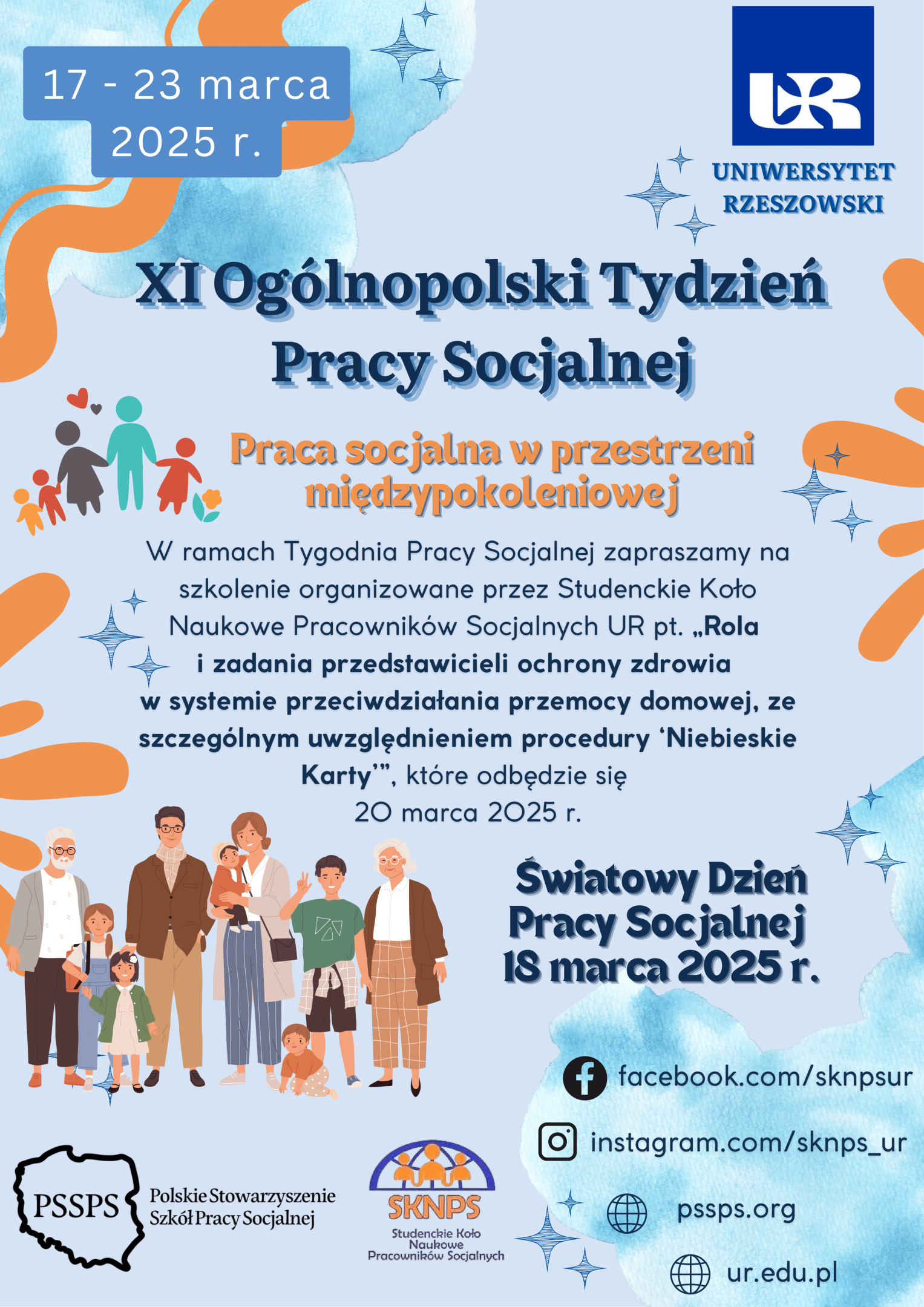 Studenckie Koło Naukowe Pracowników Socjalnych UR - pod opieką dra Sławomira Wilka - organizuje szkolenie pt. Rola i zadania przedstawicieli ochrony zdrowia w systemie przeciwdziałania przemocy domowej, ze szczególnym uwzględnieniem procedury 'Niebieskie Karty', Rzeszów 20.03.2025 r.