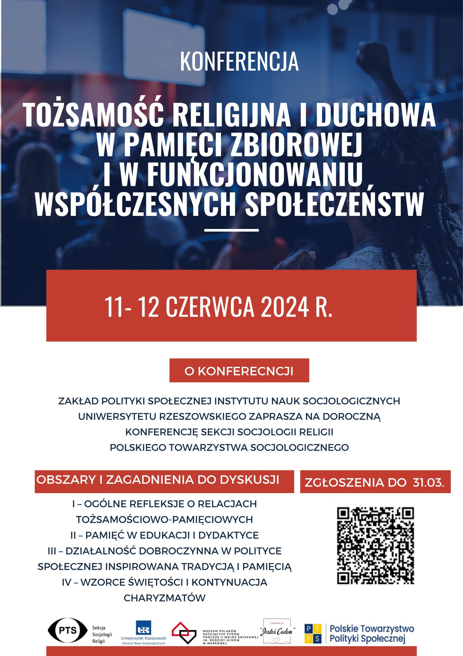 Zakład Polityki Społecznej Instytutu Nauk Socjologicznych Uniwersytetu Rzeszowskiego zaprasza na doroczną konferencję Sekcji Socjologii Religii Polskiego Towarzystwa Socjologicznego na temat: „Tożsamość religijna i duchowa w pamięci zbiorowej i w funkcjonowaniu współczesnych społeczeństw”. Konferencja odbędzie się w dniach 11-12 czerwca 2024 roku w Instytucie Nauk Socjologicznych na Uniwersytecie Rzeszowskim. Współorganizatorami konferencji są: Polskie Towarzystwo Polityki Społecznej; Muzeum Polaków Ratujących Żydów podczas II wojny światowej im. Rodziny Ulmów w Markowej; Fundacja „Jesteś Cudem”.