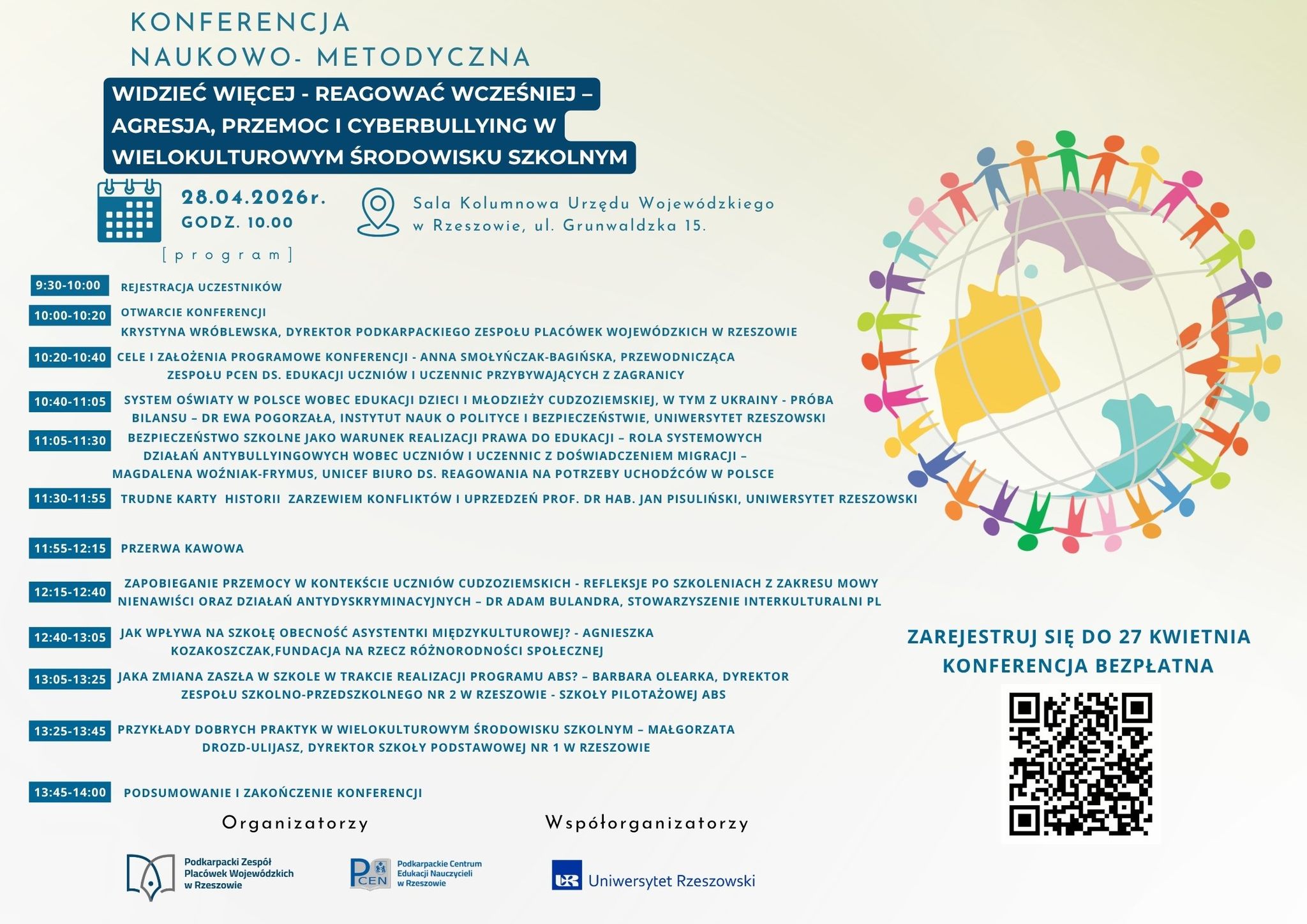 Zaproszenie na konferencję ,,WIDZIEĆ WIĘCEJ - REAGOWAĆ WCZEŚNIEJ – AGRESJA, PRZEMOC I CYBERBULLYING w WIELOKULTUROWYM ŚRODOWISKU SZKOLNYM”. Jest to wojewódzka konferencja naukowo-metodyczna organizowana przez Podkarpackie Centrum Edukacji Nauczycieli w dniu 28 kwietnia 2026 roku we współpracy z Instytutem Nauk o Polityce i Bezpieczeństwie Uniwersytetu Rzeszowskiego.