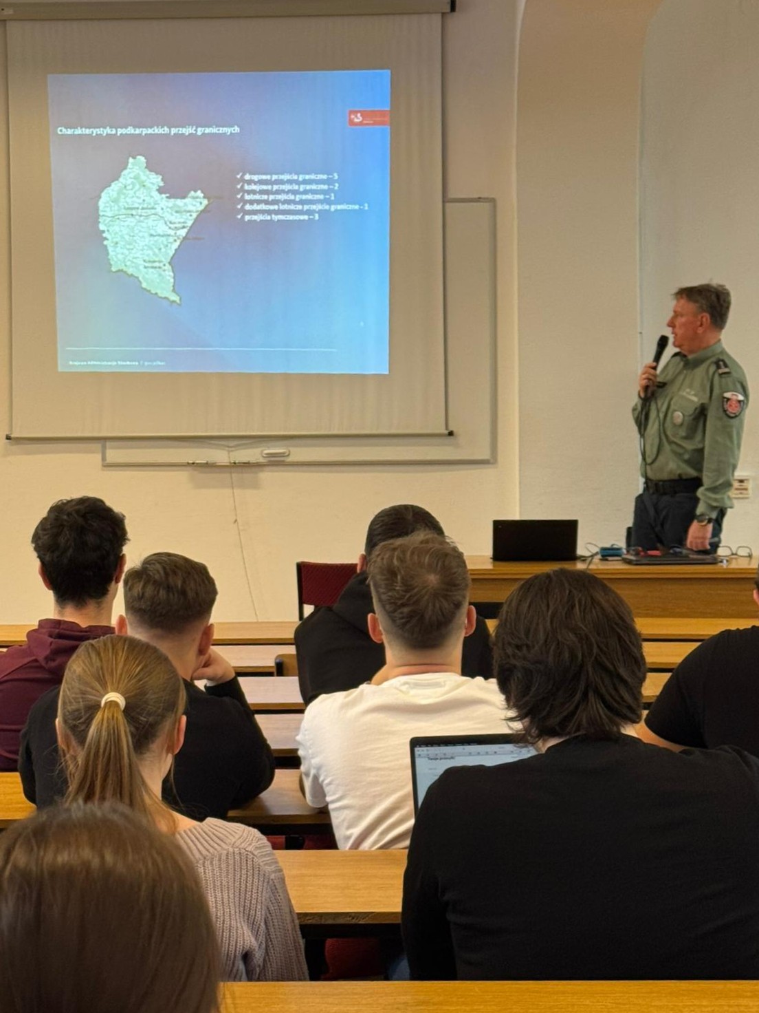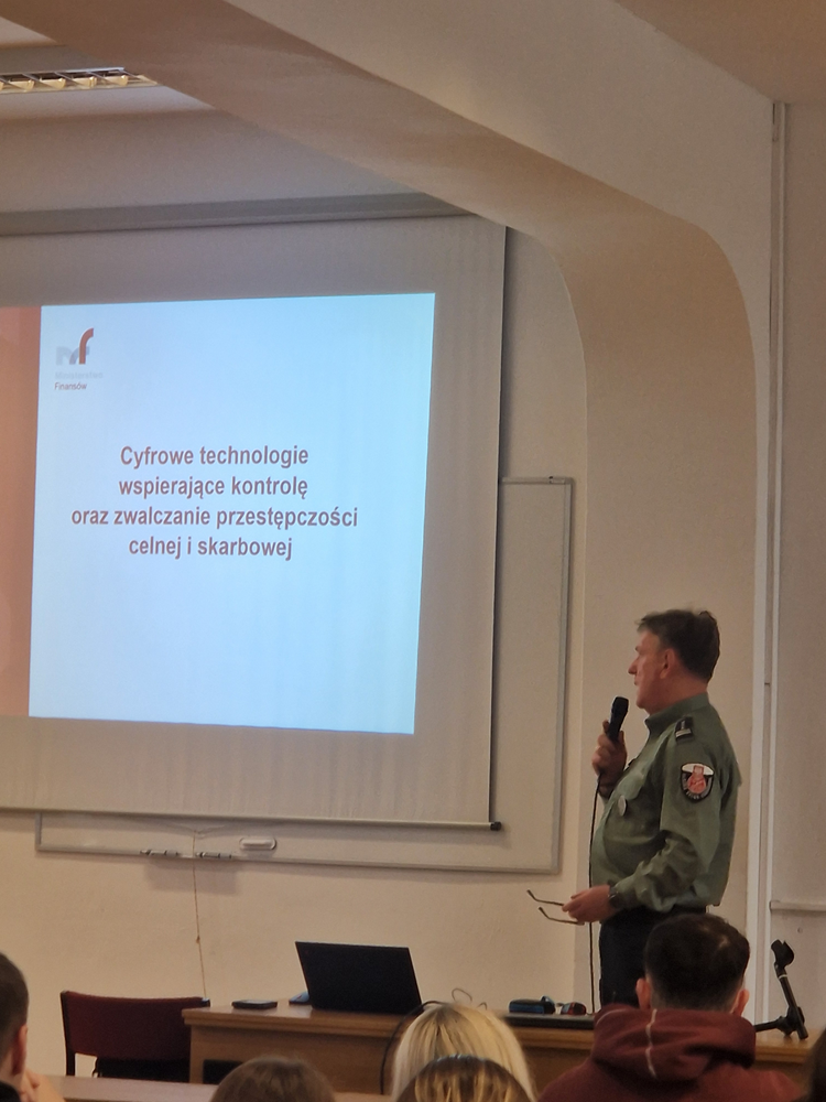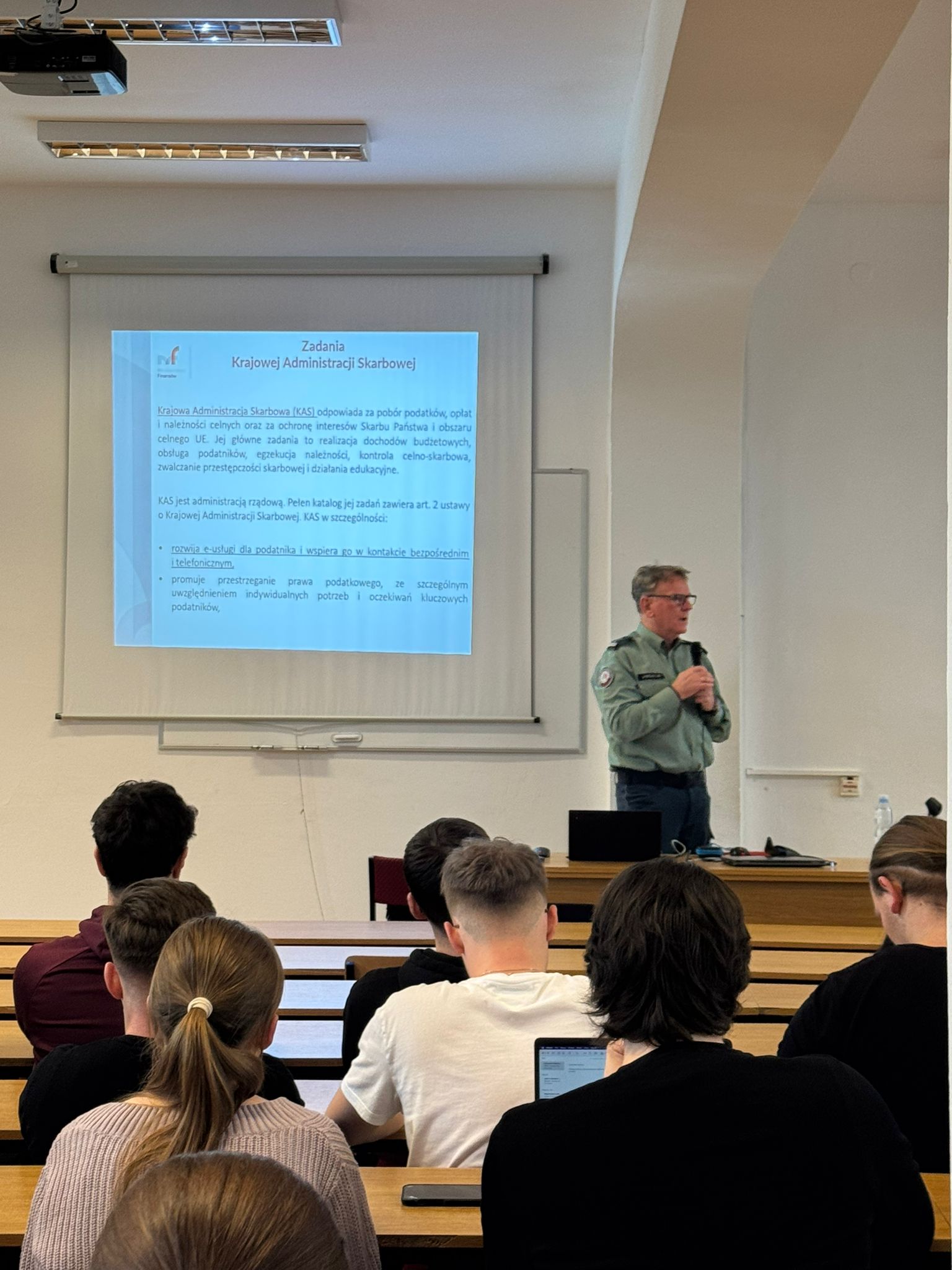 Wykład i główną część merytoryczną poprowadził Naczelnik Wydziału Systemów Granicznych oraz Centrum Kompetencyjnego Systemów Centralnych insp. Jacek Wojdylak, który przedstawił studentom oraz pracownikom naukowym najnowsze narzędzia cyfrowe wykorzystywane w pracy służb celnych i skarbowych. Omówione zostały m.in.: