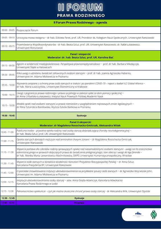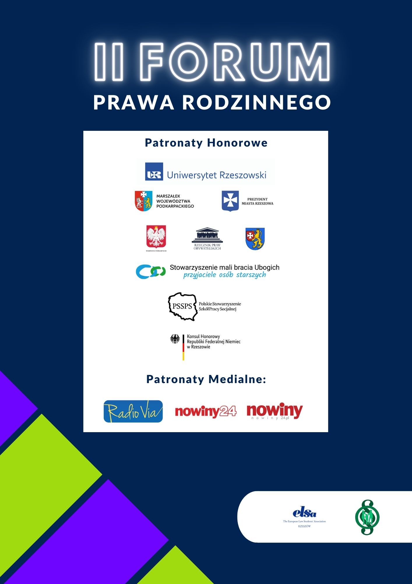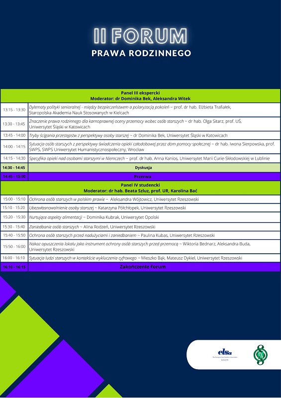 Uprzejmie informujemy o organizowanym przez Europejskie Stowarzyszenie Studentów Prawa ELSA Rzeszów II Forum Prawa Rodzinnego „Ochrona praw osób starszych. Niezależność, uczestnictwo i rozwój”, które odbędzie się w dniu 21 marca 2023 roku w formie online za pośrednictwem platformy Zoom. Współkoordynatorami oraz opiekunami merytorycznymi wydarzenia są Pani dr hab. Beata Szluz, prof. UR oraz Pan dr Rafał Łukasiewicz - nauczyciele akademiccy Uniwersytetu Rzeszowskiego.