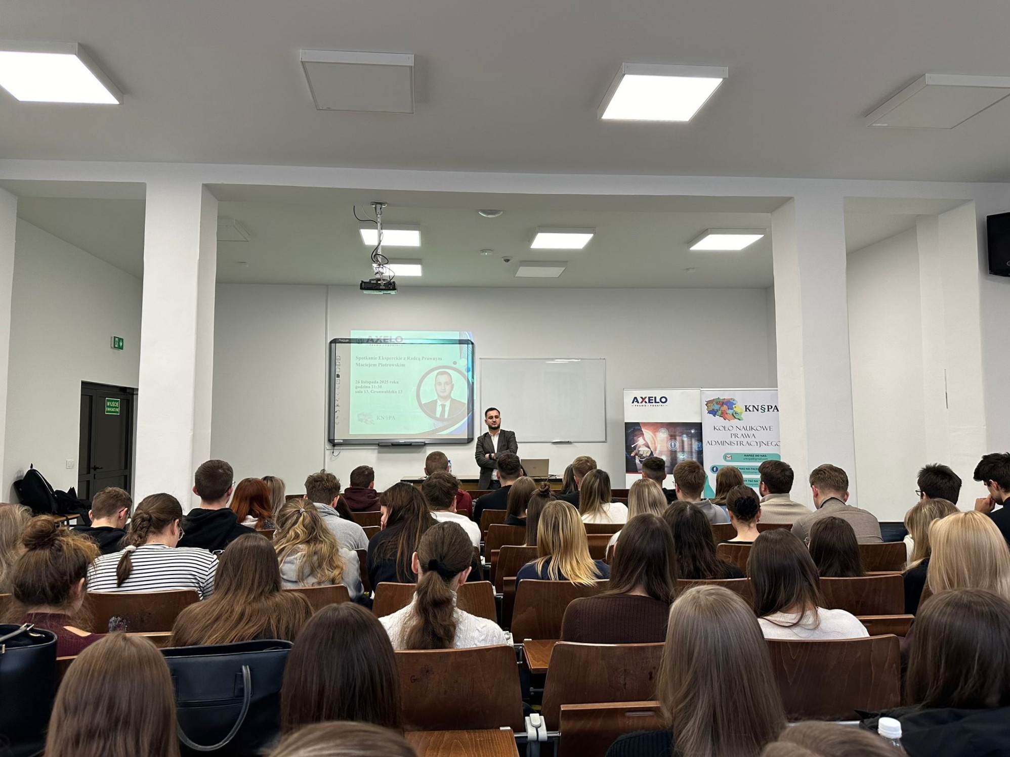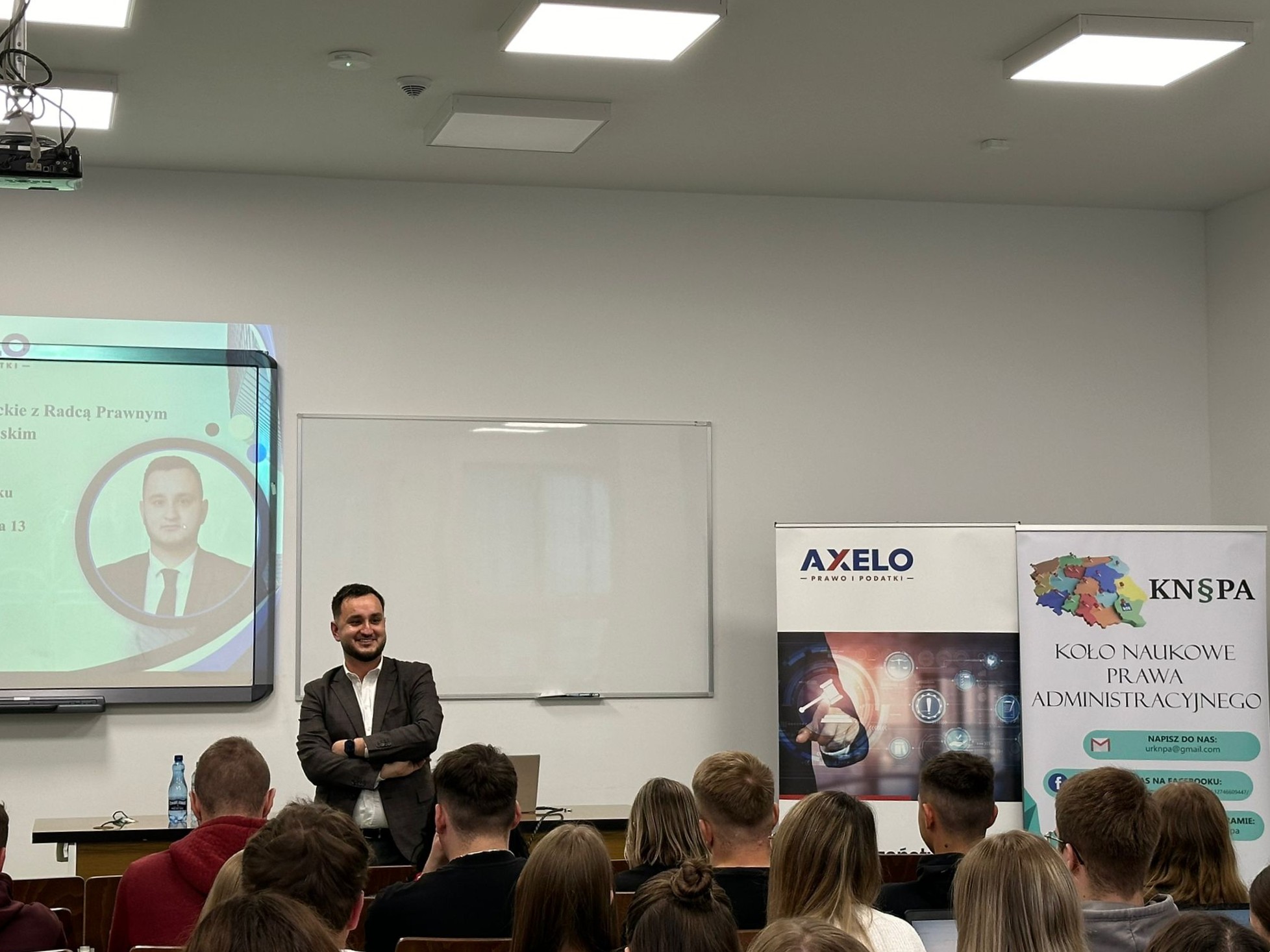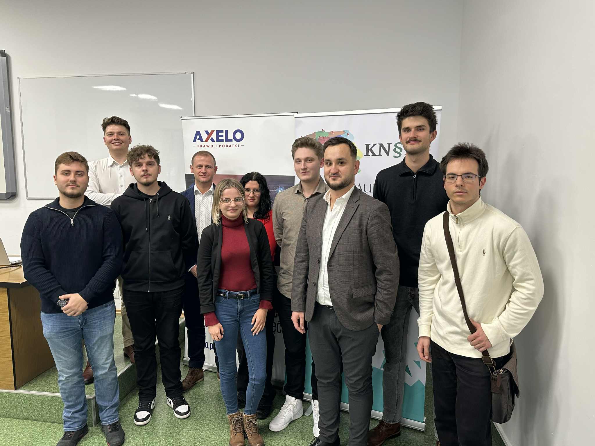 Gościem spotkania był Radca Prawny Maciej Piotrowski z Kancelarii AXELO Prawo i Podatki, który podzielił się z uczestnikami swoim bogatym doświadczeniem i praktycznym spojrzeniem na codzienność w zawodzie radcy prawnego. Prelegent przybliżył uczestnikom realia pracy w kancelarii.
