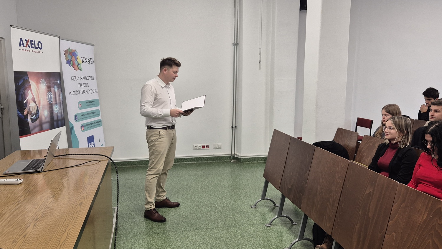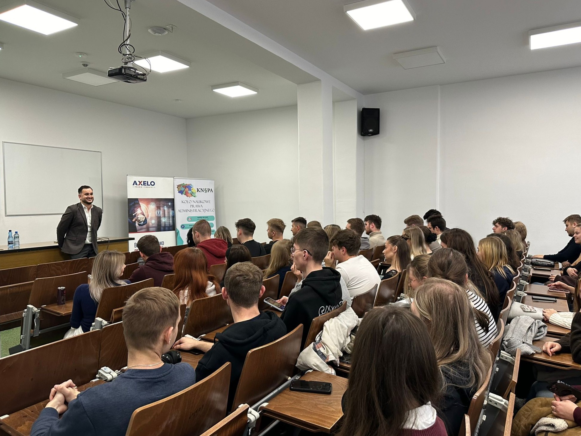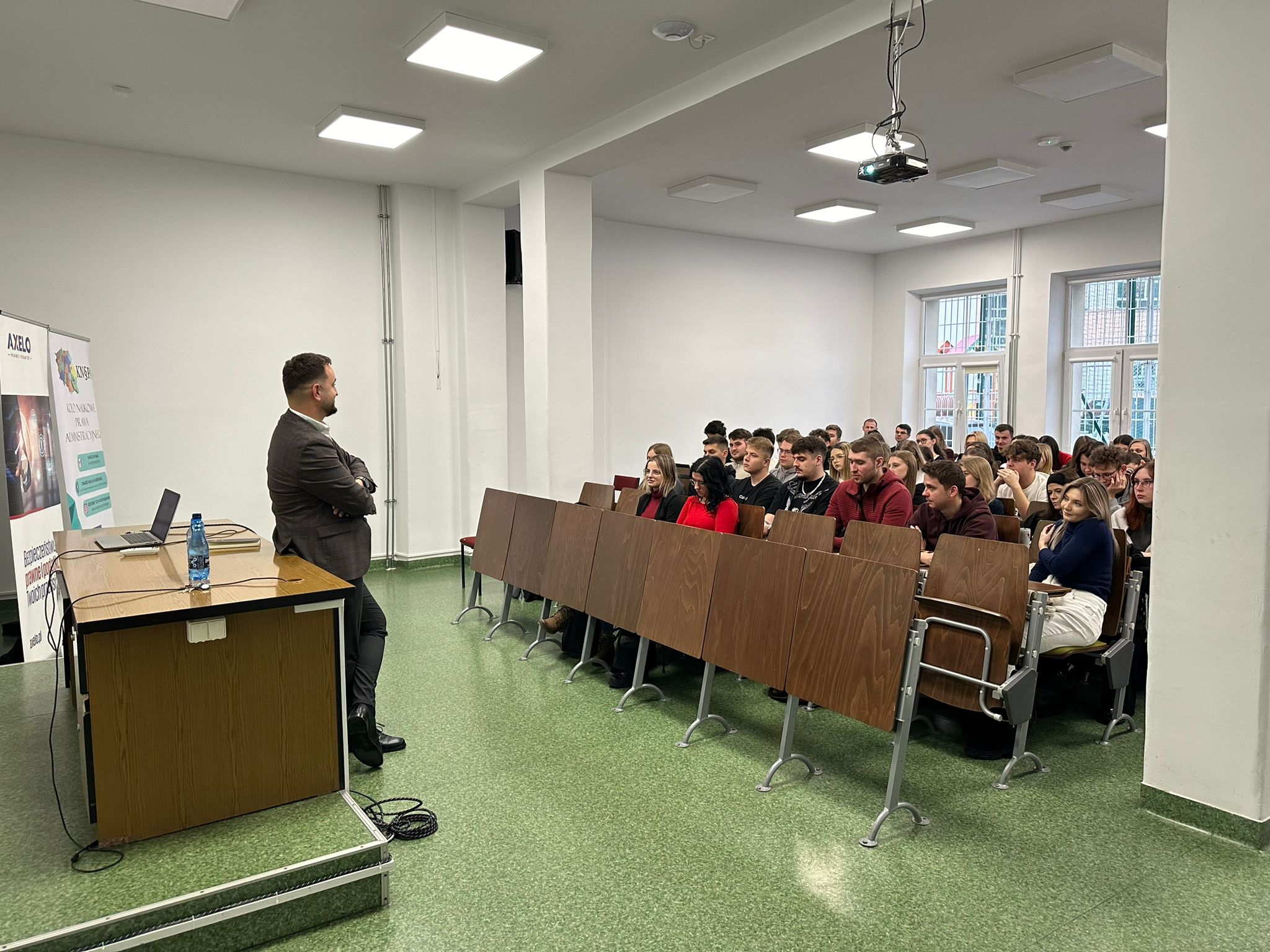 Gościem spotkania był Radca Prawny Maciej Piotrowski z Kancelarii AXELO Prawo i Podatki, który podzielił się z uczestnikami swoim bogatym doświadczeniem i praktycznym spojrzeniem na codzienność w zawodzie radcy prawnego. Prelegent przybliżył uczestnikom realia pracy w kancelarii.