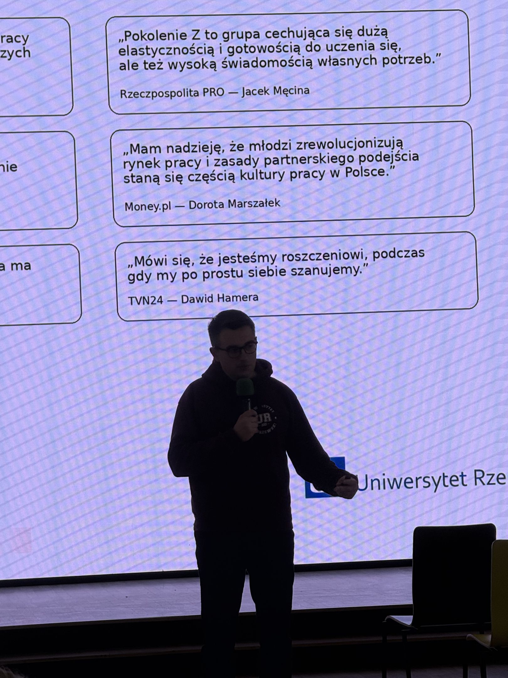 W pierwszej części wydarzenia przeprowadzono wykład pt. „Pokolenie Z na rynku pracy”, który poprowadził dr Michał Skóra z Zakładu Prawa Pracy i Ubezpieczeń Społecznych WPiA UR. W trakcie wystąpienia przedstawiono najważniejsze zmiany zachodzące na współczesnym rynku pracy. Omówiono m.in. zagadnienia pracy zdalnej, pracy platformowej oraz prawne aspekty wykorzystania sztucznej inteligencji (AI) w pracy.