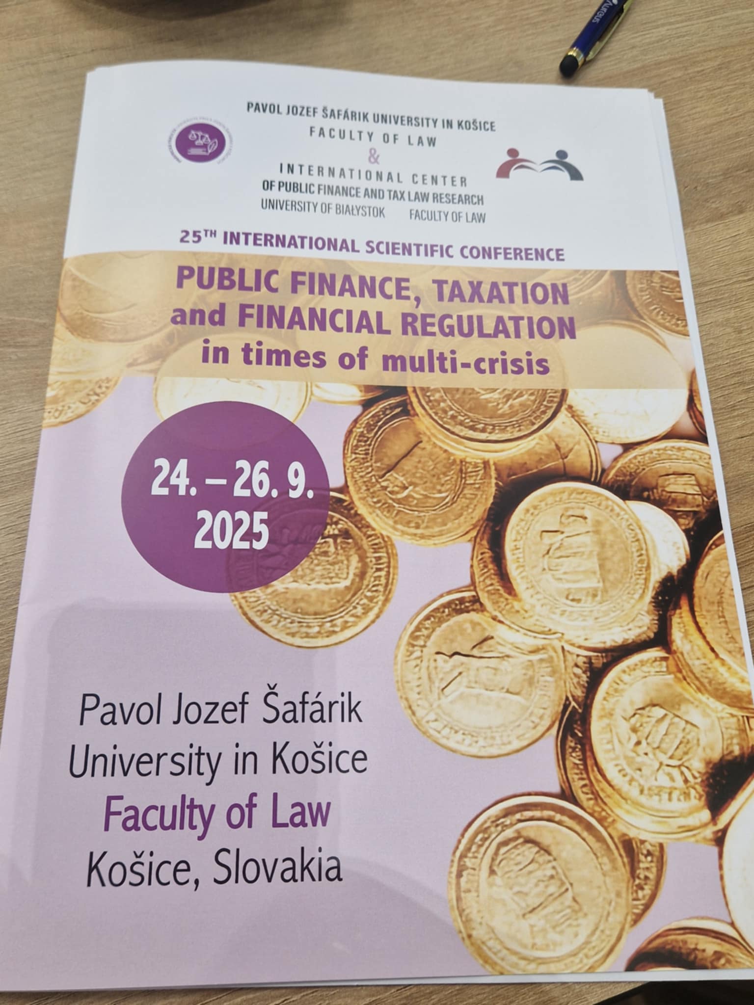W dniach 24–26 września 2025 r. pracownicy Katedry Prawa Finansowego Wydziału Prawa i Administracji Uniwersytetu Rzeszowskiego wzięli udział w 25th International Scientific Conference „Public Finance, Taxation and Financial Regulation in Times of Multi-Crisis”, zorganizowanej przez International Center of Public Finance and Tax Law Research (Uniwersytet w Białymstoku) oraz Wydział Prawa Uniwersytetu Pavla Jozefa Šafárika w Koszycach. Wydarzenie odbyło się na UPJŠ w Koszycach (Słowacja).