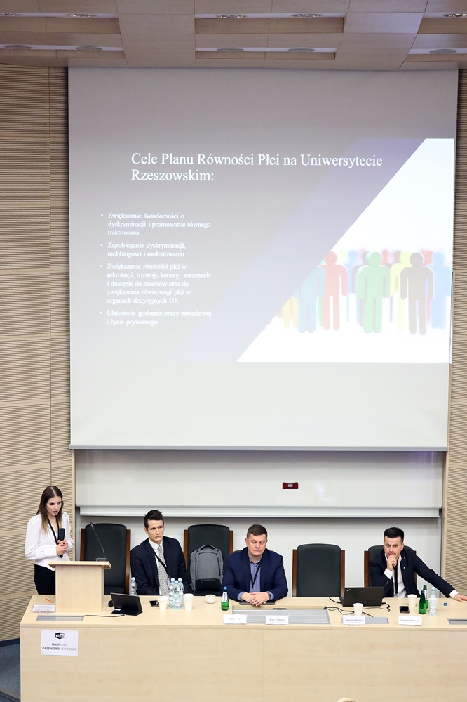 W ramach pierwszego obszaru tematycznego jako Keynote Speaker wystąpiła prof. Cilia Willem z Uniwersytetu Rovira i Virgili w Hiszpanii (wiodącej uczelni we wdrażaniu GEP), prezentując wystąpienie: Gender Equality Plans at the University: challenges and rewards. W dalszej kolejności referaty zaprezentowali i zaprezentowały: Dr Magdaléna Musilová z Uniwersytetu Comenius w Bratysławie, Telma Velez z Uniwersytetu Islandzkiego, Dr Janine Hicks z Uniwersytetu KwaZulu – Natal w RPA, Dr Ana Kaminska z Uniwersytetu Jana Kochanowskiego w Kielcach, a także profesorowie Uniwersytetu Rzeszowskiego: Roman Uliasz (radca prawny, tłumacz przysięgły języka angielskiego) oraz Paweł Korzeniowski.