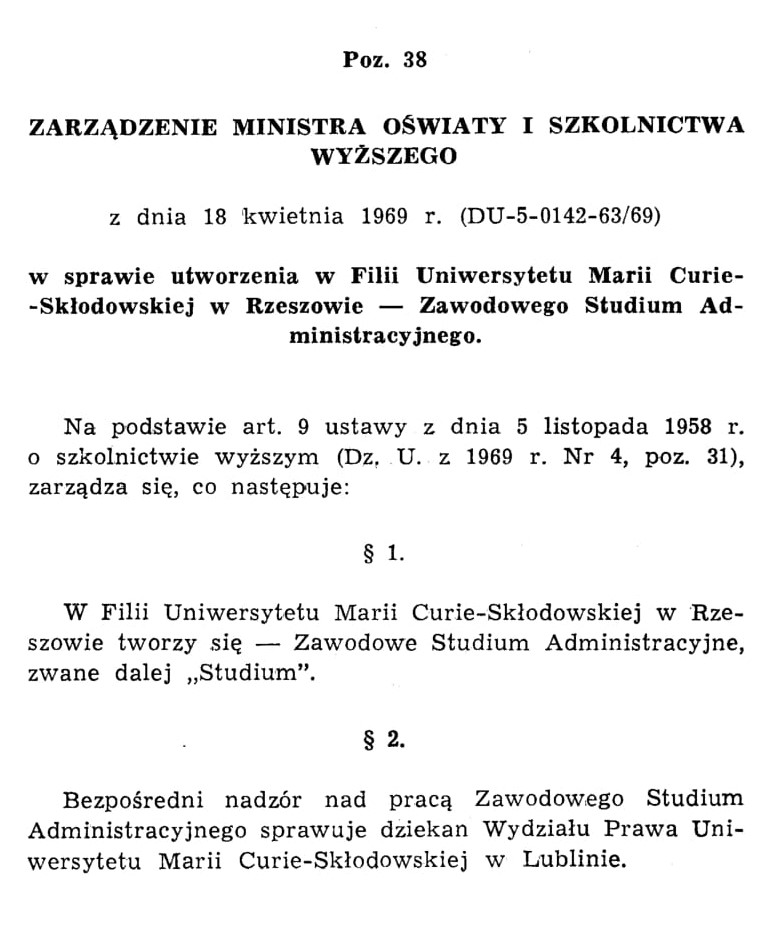 Wydział Prawa i Administracji był jednym z dwunastu Wydziałów na Uniwersytecie Rzeszowskim. Jego historia rozpoczyna się z chwilą powołania, Zarządzeniem Ministra Oświaty i Szkolnictwa Wyższego z dnia 18-go kwietnia 1969 roku, Filii Uniwersytetu Marii Curie-Skłodowskiej w Rzeszowie. Utworzono wówczas 3-letnie Zawodowe Studium Administracyjne, które zapoczątkowało w południowo-wschodniej części Polski stacjonarne studia uniwersyteckie w zakresie administracji. Od 1972 roku funkcjonowały już na tym kierunku 2-letnie uzupełniające studia magisterskie, natomiast stacjonarne magisterskie studia prawnicze uruchomiono w roku 1980. Przed włączeniem Wydziału Prawa i Administracji Filii UMCS w Rzeszowie w struktury Uniwersytetu Rzeszowskiego, studentów kształcono na kierunku – prawo, w systemie stacjonarnym i niestacjonarnym oraz kierunku – administracja w systemie niestacjonarnym. |