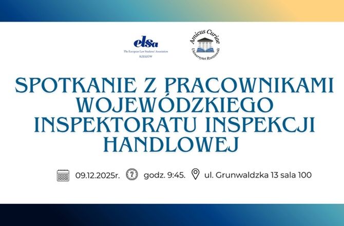 Koło Naukowe Prawa Handlowego i Gospodarczego „Amicus Curiae” oraz ELSA Rzeszów zapraszają na spotkanie z przedstawicielami Wojewódzkiego Inspektoratu Inspekcji Handlowej w Rzeszowie, które odbędzie się 9.12.2025 r. o godz. 9:45 w s. 100 w budynku WPA przy ul. Grunwaldzkiej 13.