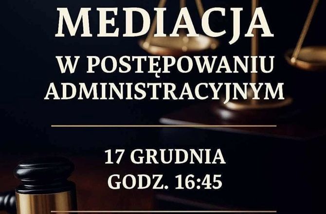 Koło Naukowe Prawa Administracyjnego UR zaprasza do udziału w spotkaniu pt. "Mediacja w postępowaniu administracyjnym", które odbędzie się 17.12.2025 r. o godz. 16:45 w s. 213 w budynku WPA przy ul. Grunwaldzkiej 13.