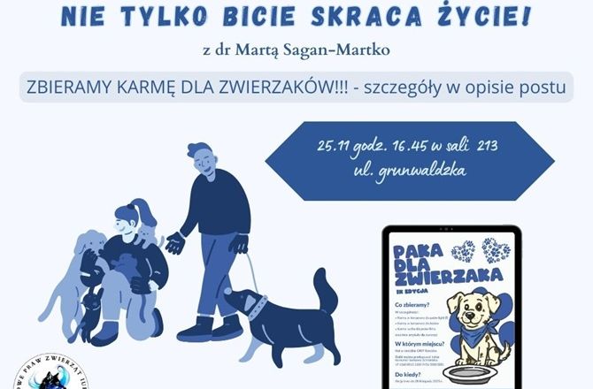Koło Naukowe Praw Zwierząt wraz z Okręgową Izbą Radców Prawnych zachęca do przyłączenia się do zbiórki na rzecz zwierząt ze schroniska oraz udziału w wydarzeniu pt. „nie tylko bicie skraca życie”, które odbędą się 25.11.2025 r.