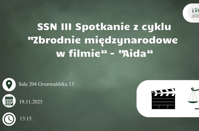 Koło Naukowe ds. Badania Zbrodni Międzynarodowych i Koło Naukowe Prawa Międzynarodowego i Europejskiego zapraszają do udziału w Studenckim Seminarium Naukowym III Spotkanie z cyklu "Zbrodnie międzynarodowe w filmie" - "Aida", które odbędzie się 19.11.2025 r. o godz. 13:15 w s. 204 w budynku przy ul. Grunwaldzkiej 13.