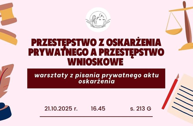 Koło Naukowe Postępowania Karnego i Prawa Karnego Wykonawczego "Temida" zaprasza do udziału w spotkaniu pt. "Przestępstwo z oskarżenia prywatnego a przestępstwo wnioskowe - warsztaty z pisania prywatnego aktu oskarżenia", które odbędzie się 21.10.2025 r. o godz. 16:45 w s. 213 w budynku WPiA przy ul. Grunwaldzkiej 13.