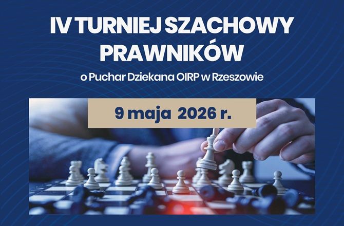 Rada Okręgowej Izby Radców Prawnych w Rzeszowie wraz z Komisją Spraw Socjalnych, Sportu i Integracji oraz Klubem Szachowym ROSZADA Przemyśl serdecznie zapraszają na IV Turniej Szachowy Prawników o Puchar Dziekana Okręgowej Izby Radców Prawnych w Rzeszowie, który odbędzie się 9.05.2026 r.
