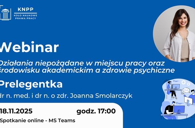Koło Naukowe Prawa Pracy serdecznie zaprasza na wyjątkowe spotkanie poświęcone psychologicznym konsekwencjom działań niepożądanych, które mogą się pojawić w miejscu pracy, jak i w środowisku akademickim, które odbędzie na platformie MS Teams w dniu 18.11.2025 r. o godz. 17:00.