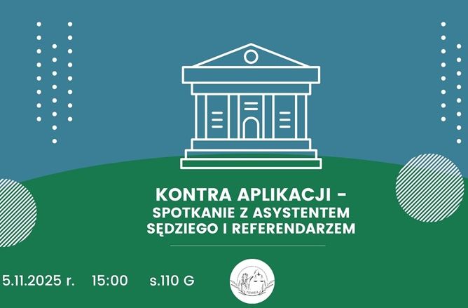 Koło Naukowe Postępowania Karnego i Prawa Karnego Wykonawczego ''Temida'' zaprasza do udziału w wydarzeniu Kontra aplikacji – spotkanie z asystentem sędziego i referendarzem, które odbędzie się 5.11.2025 r. o godz. 15:00 w s. 110 w budynku przy ul. Grunwaldzkiej 13.