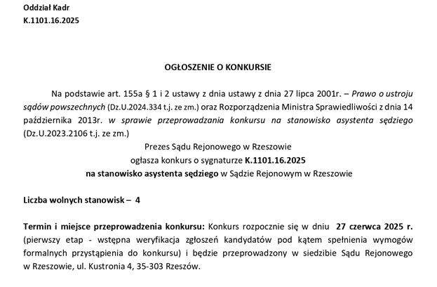 Prezes Sądu Rejonowego w Rzeszowie ogłasza konkurs o sygnaturze K.1101.16.2025 na stanowisko asystenta sędziego w Sądzie Rejonowym w Rzeszowie.