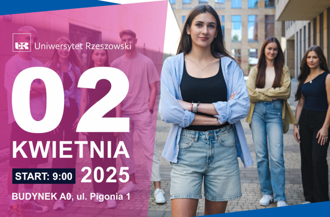 Uniwersytet Rzeszowski zaprasza na Dzień Otwarty połączony z XVI Uniwersyteckimi Targami Pracy, który odbędzie się 2 kwietnia 2025 r., od godziny 9:00 do godziny 14:00 w budynku A0 przy ul. Pigonia 1 w Rzeszowie.