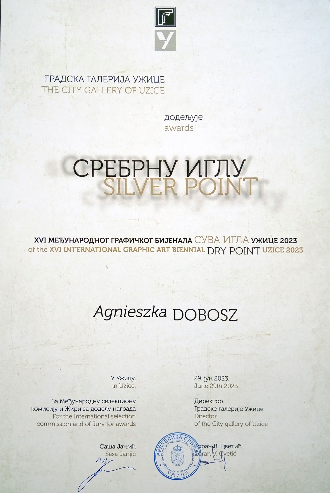 dr hab. Agnieszka Dobosz Bruchnalska, prof. UR została laureatką II Nagrody SILVER POINT na 16. Międzynarodowym Biennale Grafiki / 16th International Graphic Art Biennial, Dry Point, Užice w Serbii. Na tegoroczne biennale jury zakwalifikowało 84 artystów. Nagrodzone prace stają się częścią kolekcji współczesnej grafiki należącej do The City Gallery of Užice.